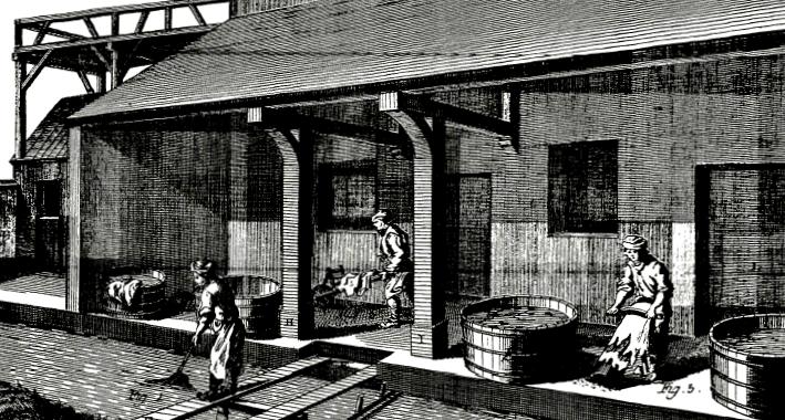 Les peaux, nettoyées & égouttées, sont alors traitées à la chaux, pour faire tomber le poil ou bourre. Cette opération est effectuée dans des cuves appellées "plains" que l'on voit ci-dessous (Encyclopédie Diderot)
