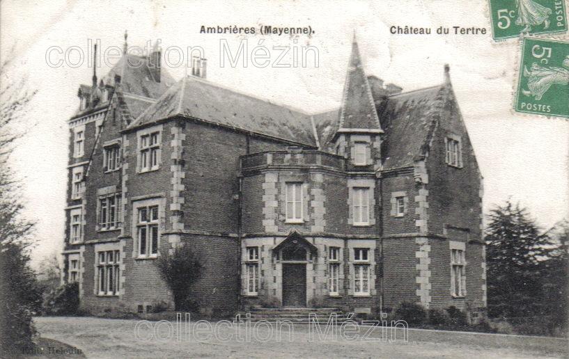 Ambrières, château d'Ambrières (maison construite sur les ruines de l'ancien château de Guillaume le Conquérant ; détruite après le guerre 14-18, remplacée par une villa, achetée après la guerre 39-45 pour en faire la mairie)