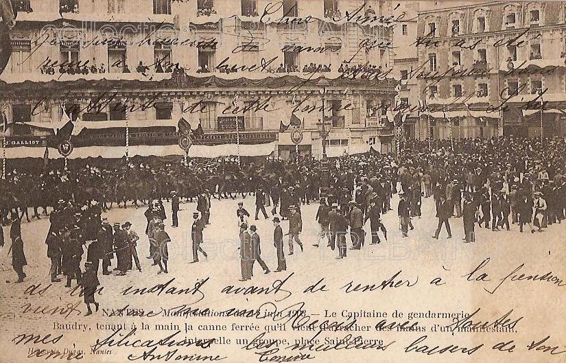 Nantes, manifestations du 14 juin 1903 : le capitaine Baudry, tenant à la main la canne ferré qu'il vient d'arracher des mains d'un manifestant, interpelle un groupe place Saint-Pierre.