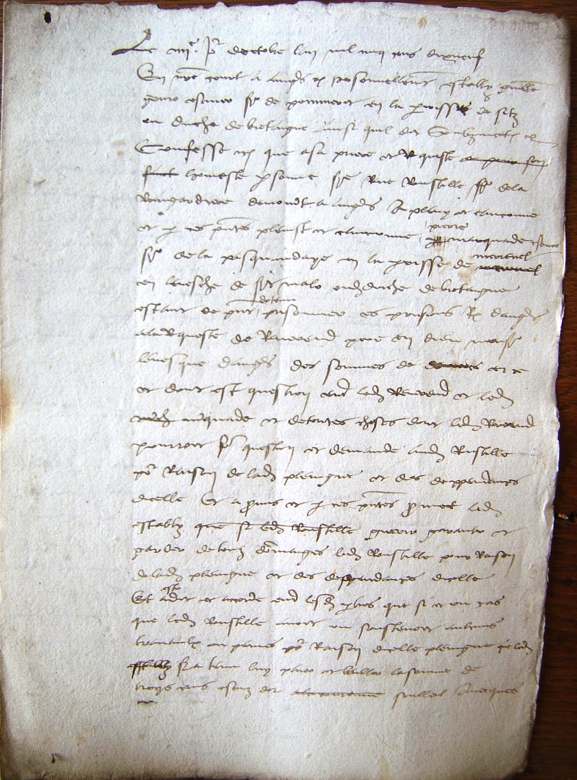Le 20 janvier 1594 avant midy en la court du roy nostre sire à Angers endroit par devant nous (Chuppé notaire royal Angers) personnellement establye Perrine Gandon veufve de déffunct François Hodée demeurant en la paroisse de Bouillé Menard estant de présent en ceste ville d’Angers confesse etc avoir retyré de Loyse Leroyer veufve de défunt David Duflou vivant corroyer en ceste ville et y demeurant paroisse St Maurille à ce présente les papiers et pieczes qui s’ensuivent qui sont jusques au nombe de 8 pieczes en papier