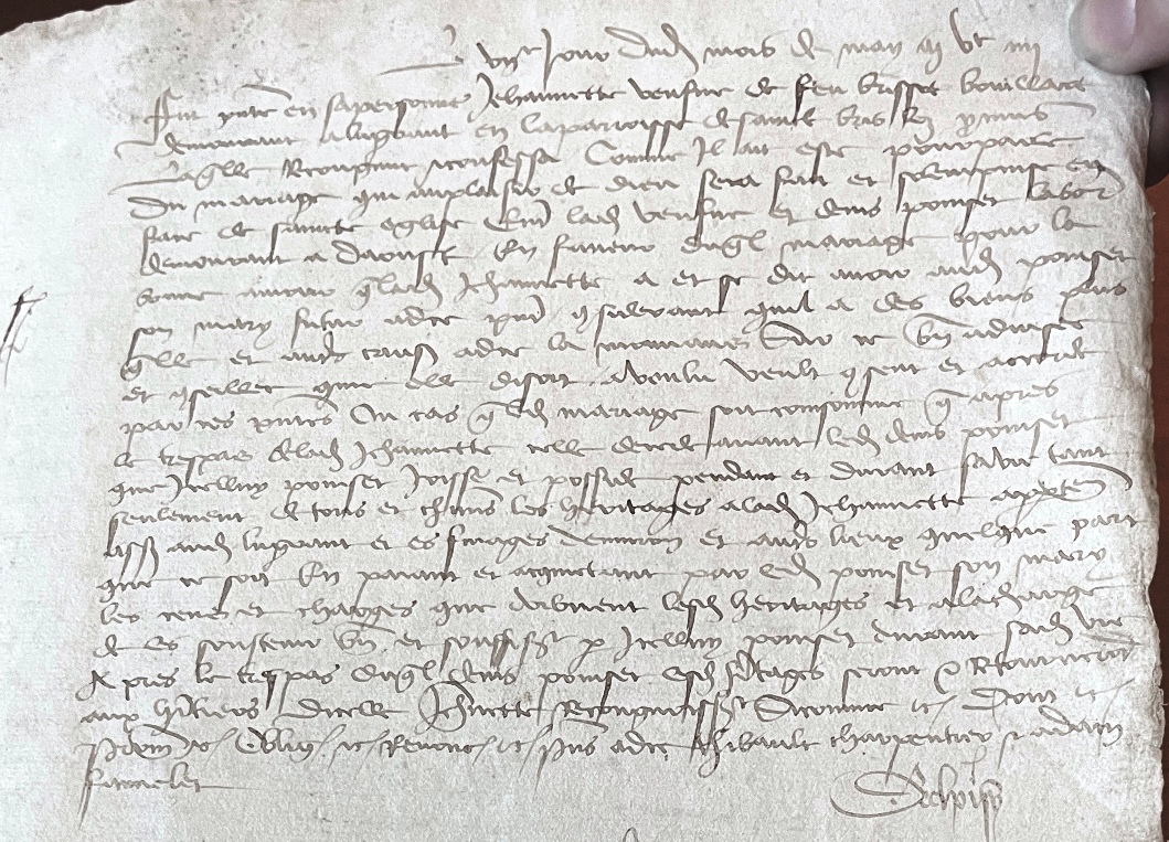 1617.05.16 vue 11 – Furent présens Pasquier Gailliat tailleur d’habits fils de Denis Gailliat et de Nicolle Lange et procéddant de l’auctoritté et consentement d’iceulx, et de Gratien Gailliat oncle et parrain, Samson Gailliat aussi oncle dudit Pasquier, Crespin Proudhomme leur beau frère, et messire Pasquier Gilquin prêtre parrain et amy dudit Pasquier Gailliart tous demourans à Sordun hormis ledit Gratien qui demeure à Jutigny et ledit Gilguin à Donner d’une part, et Jehanne Lange fille de deffunct Jehan Lange dit Durisme vivant laboureur et de Marion Valtin ses père et mère proceddans aussy de l’auctoritté et consentement de Jehan Chevrier le jeune à présent mary de Marion Valtin et d’icelle Valtin a la puissance, et encore de discrette personne messire Fiacre Valtin prêtre cousin de ladite Lange, Creat Jeubert et Jehan Herbelin ses beaufrères, Denis Pascherat son cousin et parrain, et de maistre Nicolas Bardin procureur es sièges royaulx de Provins leur amy d’autre part, lesquels Pasquier Gailliat et Jehanne Lange de l’advis et consentement des dessusdits ont promis et prometctent par ces présentes eulx prendre l’un d’eulx l’autre par foy et loy de mariage au plus tost que faire se pourra et sera advisé entre eulx leursdits parens et amis sy Dieu et nostre mère Ste église y consentent, en faveur et contemplation duquel futur mariage a esté accordé et promis par ledit Denis Gaillat et sa femme père et mère dudit futur espoux d’habiller et vestir leur fils bien et honnestement suivant sa qualitté, baguer ladite furure espouze aussy de bagues et joyaulx, et faire moictyé des frais de bancquet le tout à leurs frais, et encores de marier ledit Pasquier leur fils franc et quite, et y a esté convenu que parce que ldite Lange future espouze apportera en leur communaultté tous son bien qui luy est advenu et escheu par la succession dudit deffunct Jehan Lange dit Derisme son père, qu’advenant le décès de l’un ou l’autre desdits futurs espouz sans enffans procédez de leur corps en légal mariage sequamment ledit Gailliat futur espouz en ce cas ladite Lange future espouze survivante reprendra par préciput et … part sur les biens de leur communaulté la valleur de moitié de la somme à laqualle se trouvera monter le droict successif et mobilier qui luy appartient en la succession dudit feu son père jusques à présent ou lors dudit mariage, et si ladite Lange future espouze décéda la première et auparavant ledit futur espoux sans enffans procédés de leurs corps comme dict est en ce cas ses héritiers reprendront ladite moictié et ce fait le surplus se partagera entre les héritiers du survivant et premier décédé, et au surplus ledit futur espoux a douée et doue ladite future espouse du douaire coustumier, car ainsi a esté accordé et aultrement n’eust esté fait