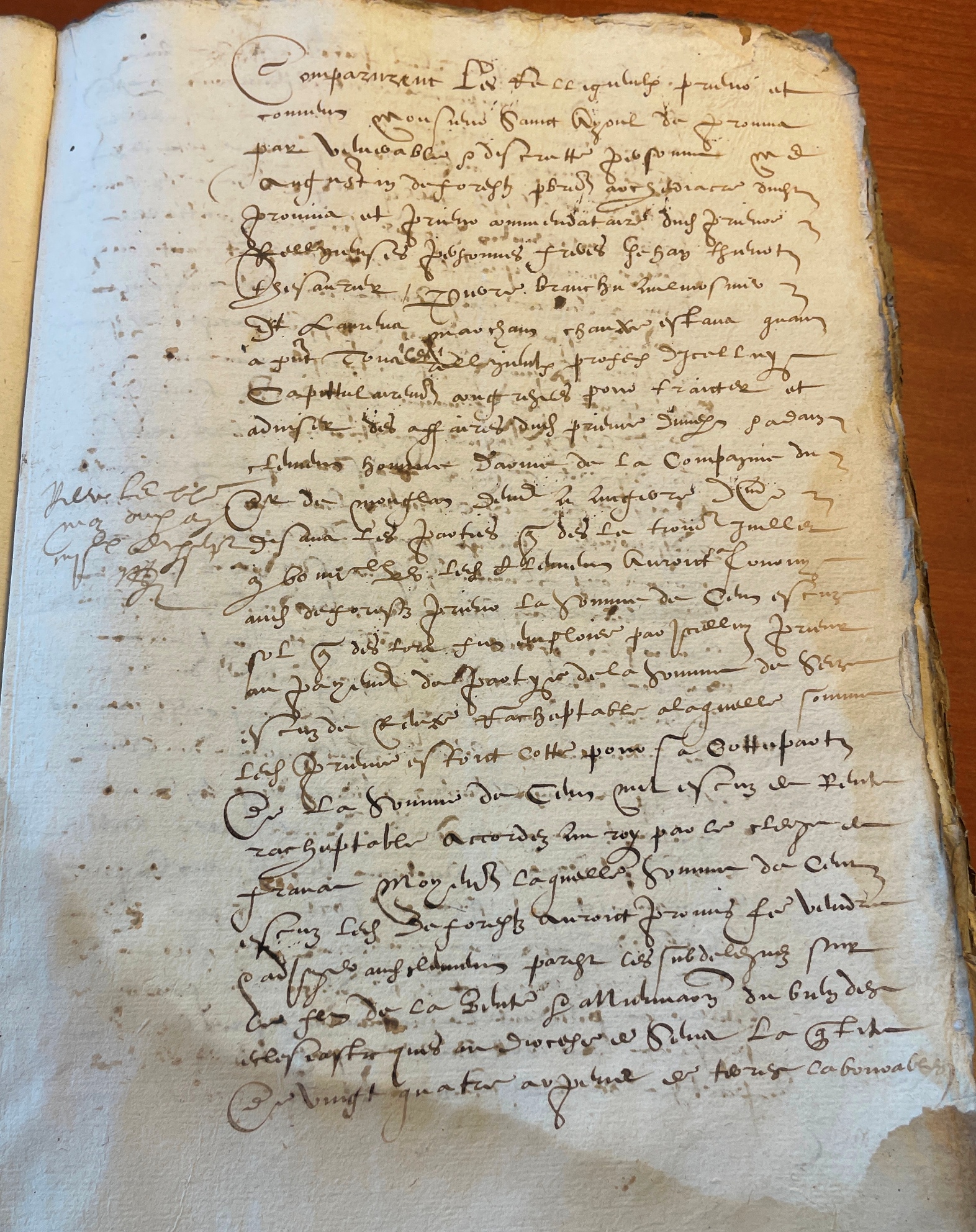 Pour payer sa contribution à la rente de 100 000 écus, le prieur s’est fait aidé et a alors reçu d’Adam Clement 100 écus. Ce dernier n’a pas fait un don mais un prêt, et comptait bien être remboursé un jour… mais il n’en est rien, il n’est que partiellement remboursé, et malgré plusieurs sentences obtenues à Provins contre le couvent, il ne voit pas un seul écu, et le couvent de son côté a subi des dégâts importants pendant les troubles et doit faire beaucoup de travaux, donc n’a plus les moyens. Adam Clement transige et accepte que le couvent lui laisse en échange de ses écus 24 arpents de terre. Mais à l’époque la terre est divisée en une multitude de petites pièces de terre et le notaire doit donner le bornage de chacune. Ainsi, après 3 pages pour rappeler les faits qui amènent à la transaction, il faut encore 5 pages pour lister toutes ces petites pièces de terre. Et si j’ai tout retranscrit c’est que cet acte me tient à coeur, car j’y ai découvert le métier d’un de mes ascendants et c’est pour moi un pur bonheur tant la paroisse qu’il habitait, Augers-en-Brie, manque de registres paroissiaux etc..