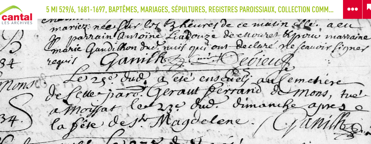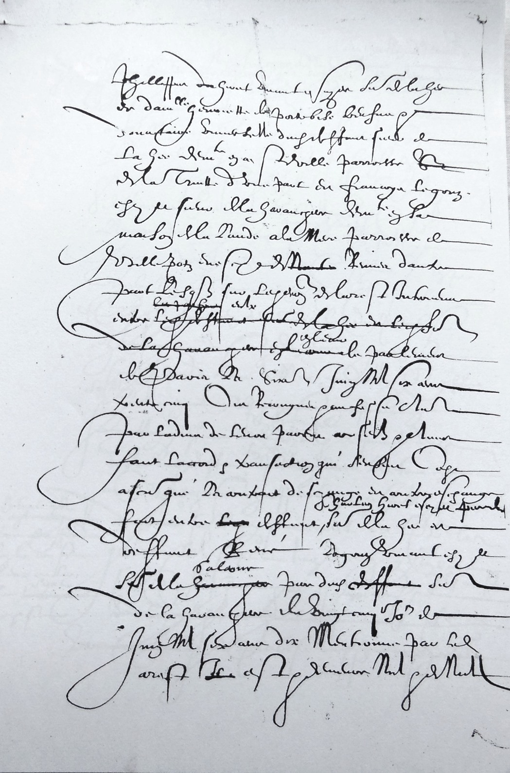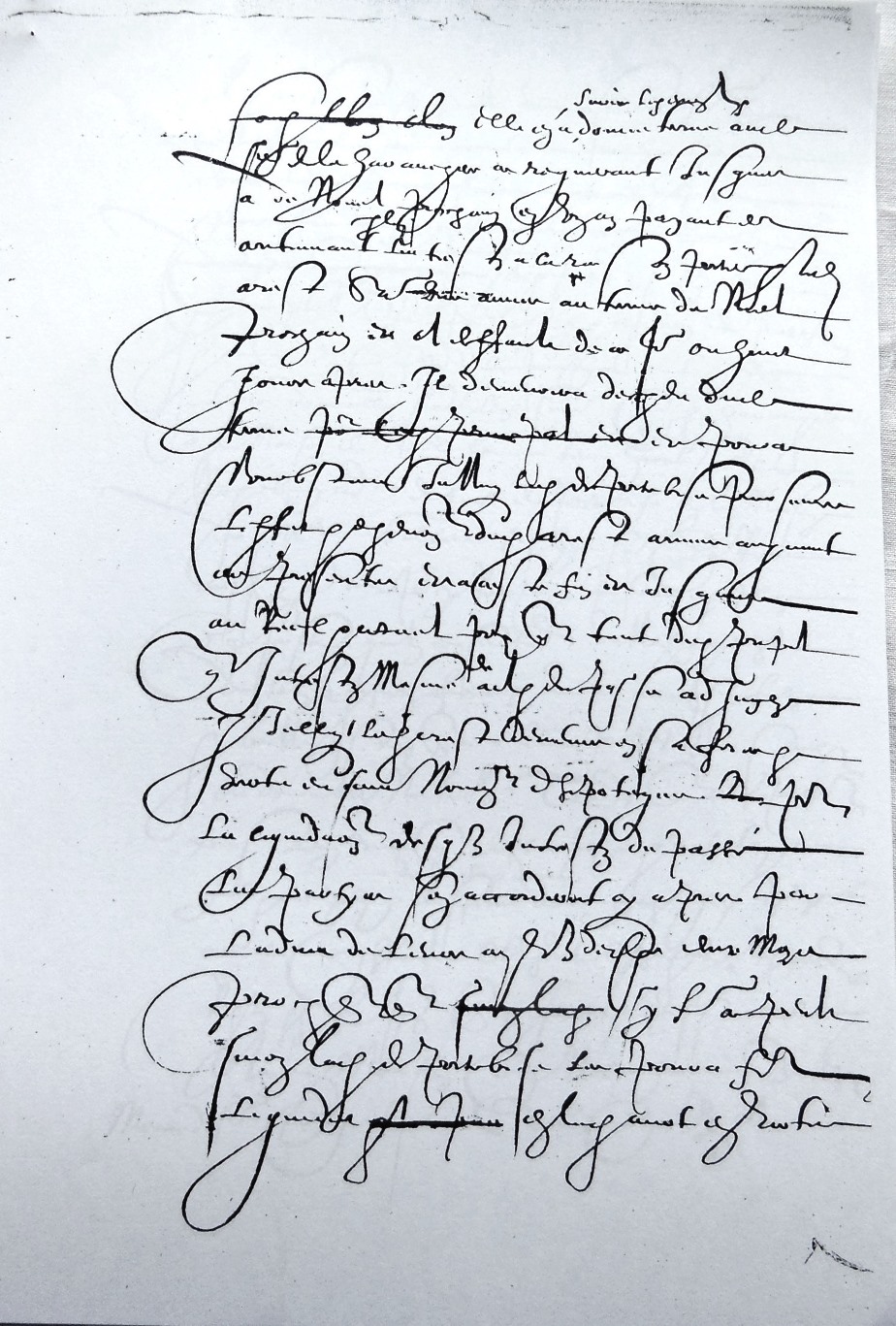 Le 17 février 1545 (calendrier Julien, soit avant Pâques qui était le 25 avril 1546, donc 1546 n.s. – devant Marc Toublanc notaire royal à Angers) Comme procès fust et soyt meu par devant monsieur le séneschal d’Anjou ou messieurs son lieutenant général et particulier à Angers entre les religieuses abbesse et couvent du moustier et abbaye de notre Dame du Ronceray de ceste ville d’Angers demanderesses et déffenderesses d’une part, et les religieux prieur du prieuré de la Haye aux Bonshommes sis et situé en ceste ville d’Angers déffendeurs et aussi demandeurs d’aultre pert, sur ce que chacune des parties disoit c’est à savoir lesdites religieuses abbesse et couvent de Notre Dame de ceste dite ville d’Angers disoient que à cause de l’ancienne fondation et dotation dudit moustier elles estoient dames de la terre fief et seigneurie d’Espinatz, le fief de laquelle se estend audit lieu d’Espinatz ès paroisse de Monstreuil Bellefroy, Cantenay et ès environs, et que le lieu et maison noble ses appartenances et dépendances, vulgairement appellées l’Espine, sis au bourg dudit lieu de Monstreuil Bellefoy estoit leur fief, nuepce et seigneurie, et pour raison de ladite maison ses appartenances et dépendances et de certaines terres estantes en cousté et vallée tirant sur la rivière de Mayenne et sis au derrière de ladite maison estoit le fief seigneurie et nuepce desdites religieuses abbesse et couvent de Notre Dame d’Angers et demandoient en estre obéies comme dames de fief avecques despens et intérests ; à quoy de la part desdits prieur religieux dudit prieuré estoit dit que ladite maison noble ses appartenances et dépencances de l’Espine estoit leur fief et nuepce ensemble ledit lieu et terre appellé les Vaulx estans sis et situé au derrière de la maison de l’Espine par les faits moyens et raisons qu’ils alléguoient ; et estoient sur ce en involution de procès, pour ce est il que en la cour du roy notre sire à Angers endroit par devant nous personnellement establys maistres Mathurin Rabegeau licencié ès loix procureur et soy faisant fort desdites religieuses abbesse et couvent de Notre Dame d’Angers demandeurs et déffendeurs d’une part, et maistre Jacques Surguyn licencié ès loix au nom et comme procureur desdits religieux et prieur dudit prieuré de la Haye aux Bonshommes aussi demandeurs et deffendeurs d’aultre part, lesquels procureurs ont promis doibvent et sont demeurés tenus faire ratiffier et avoir agréable le contenu en ces présentes respectivement dedans le jour et feste de la Nativité Notre Dame dicte Angevine, et en bailler lettres de ratiffication vallables les ungs aux autres dedans le jour et feste d’Angevine, à la peine de tous intérests ces présentes néanmoins etc soubzmetant eulx esdits noms scavoir est ledit Rabergeau tous et chacuns les biens dudit moustier et abbaye de Notre Dame d’Angers présents et advenir et ldit surguyn tous et chacuns les biens dudit prieuré aussi présents et advenir, lesquels après avoir esté sur les lieux et en présence de noble homme Hardouyn de Lussigni sieur de l’Espine et après avoir veu les tiltres et fait communication de l’un à l’aultre et de leur conseil de chacune desdites parties ont transigé pacifié et accordé et appointé et encores etc transigent paciffient accordent et appointent en la forme et manière qui s’ensuit, c’est à savoir que le grand corps de maison où est la salle haulte et le celier dessoubz comprins le vir, celier, boulangerie et une maison estent en appentis à la grand cour de ladite maison seigneuriale de l’Espine le tout tenant ensemble tirant vers l’église dudit lieu de Monstreuil Bellefroy et depuis le coign de la muraille estant en ladite cour et où seront mis et assis bournes tirant en droit fil à la grande porte de ladite maison de l’Espine, est et demeure le fief seigneurie et nuepce desdites religieuses abbesse et couvent du moustier et abbaye de Notre Dame d’Angers, joignant d’un cousté lesdites choses estant audit fief desdites religieuses aux maisons pressouer et jardin dudit lieu de l’Espine et à ung autre grand corps de maison contigü et joignant ledit grand corps de maison cy dessus déclaré, et qui demeure auxdites religieuses comme estante leur fief et nuepce ; et auxdits religieux et prieur demeure ledit corps de maison auquel y a une salle basse depuis le coign de muraille où sera mise et assise ladite bourne, ensemble les jardins tirant vers les moulins de Monstreuil demeurent le fief et nuepce desdits religieux et prieur de l’abbaye aux Bonshommes ; et en tant que touche la pièce de terre qui est en cousté estant au derrière de ladite maison de l’Espine appellé les Vaulx où y a boys taillis boucaiges et noyers dans et depuis une joincture et fante de muraille à l’endroit de laquelle joincture et fante sera mis une bourne et une autre bourne près les soubzerain noyer tirant au bas dez Vaulx et près ladite rivière de Mayenne à une autre bourne qui sera mise près ladire rivière vis-à-vis et au droit fil l’une de l’aultre, faisant la séparation et division dudit corps de maison cy dessus mentionné, ladite terre des Vaulx tirant devers ladite église maison presbitérale maison et jardin de Estienne Guillebault et Jehan Houessart sergent royal tout ainsi que se poursuivent lesdits Vaulx dedans et depuis ladite fente de muraille estant en ladite maison et bournes qui seront mises tirant vers ladite église de Monstereul maison jardin desdits Guillebault et Houessart demeure le fief et nuepce desdits religieuses abbesse et couvent et le surplus desdits Vaulx tirant vers lesdits moulins de Monstereul et la porte de Monstereul où passent les grands bapteaulx est et demeure le fief et nuepce desdits religieux et prieur de la Haye et pour raison de ladite maison cour celier vir et aultres choses cy dessus déclarées qui est le fief desdites religieuses abbes