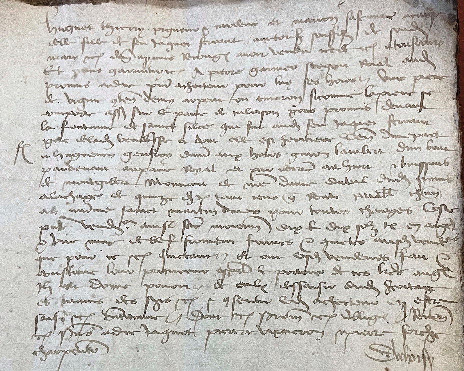 1502.09.01 vue 3038 – Huguet Thierry pigneur et cardeur et Marion sa femme à cause d’elle fille de feu Jacquet Ferant auctorisée suffisamment de sondit mary demeurant à Provins recognurent avoir vendu cédé à toujours et promis garantir à Pierre Garnier sergent royal audit Provins ad ce présent acheteur pour luy ses hoirs une piece de vigne contenant demy arpent ou environ comme la piece se comporte assise sur le pavé de Culoison près Provins devant la fontaine de Sainct Siloe qui fut audit feu Jaquet Ferant père de ladite venderesse et dont elle est héritière … moiennant 10 livres 10 sols tz en argent …