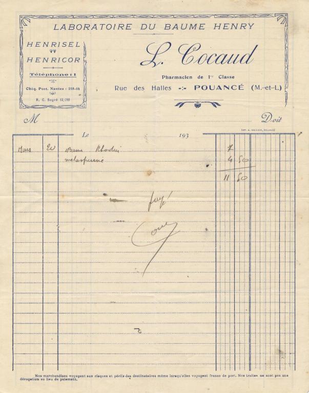 Pouancé, la pharmacie au temps de Cocaud et son baume Henry