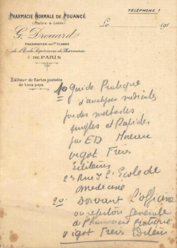 Ce papier est à en-tête de Drouard, et il y est indiqué: pharmacien, mais aussi éditeur de cartes postales de tous pays ! Ceci serait impensable de nos jours.