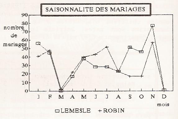 Ils ont beaucoup marié et respecté la tradition. La saisonnalité des mariages, étudiée ci-contre en nombre moyen de mariages par mois, est de type prérévolutionnaire.