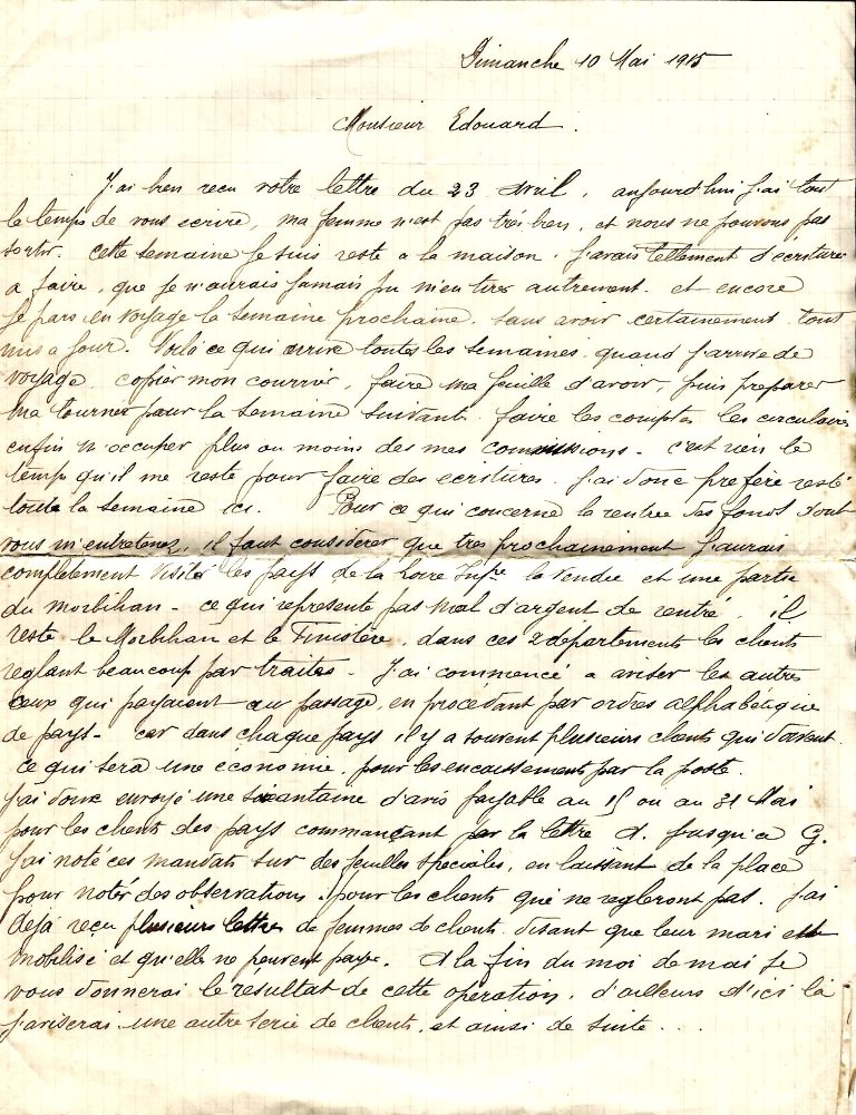 faire des écritures, j’ai donc préféré rester toute la semaine ici. Pour ce qui concerne la rentrée des fonds dont vous m’entretenez, il faut considérer que très prochainement j’aurais complètement visité les pays de la Loire Inférieure, la Vendée et une partie du Morbihan, ce qui représente pas mal d’argent de rentré. Il reste le Morbihan et le Finistère, dans ces 2 départements les clients réglant beaucoup par traites. J’ai commencé à aviser les autres ceux qui payaient au passage, en précédant par ordre alphabétique de pays, car dans chaque pays il y a souvent plusieurs clients qui savent ce qui sera une économie pour les encaissements par la poste, j’ai donc envoyé une soixantaine d’avis payable au 15 ou au 31 mai pour les clients des pays commençant par la lettre A jusqu’à G, j’ai noté ces mandats sur des feuilles spéciales, en laissant de la place pour noter des observations pour les clients qui ne règleront pas, j’ai déjà reçu plusieurs lettres de femmes de clients disant que leur mari est mobilisé et qu’elles ne peuvent payer. A la fin du mois de mi je vous donnerai le résultat de cette opération, d’ailleurs d’ici là j’aviserai une autre série de clients, et ainsi de suite …