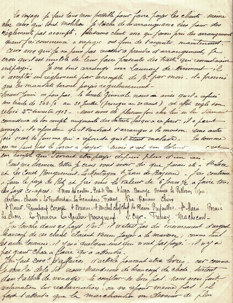 (f2) En voyage, je fais tout mon possible pour faire payer les clients, même chez ceux qui sont mobilisés, je tâche de m’arranger avec eux pour des règlements par acompte. Plusieurs clients avec qui j’avais pris des arrangements quand j’ai commencé à voyager ont fini par s’aquiter maintenant. Ceux avec qui je ne peux pas réussir à prendre d’arrangement, je crois qu’il est inutile de leur faire présenter des traites qui restraient impayées. Je me suis arrangé avec Launay de Merimont, il a accepté un règlement par acompte de 50 F par mois, il a promis que les mandats seront payés régulièrement.