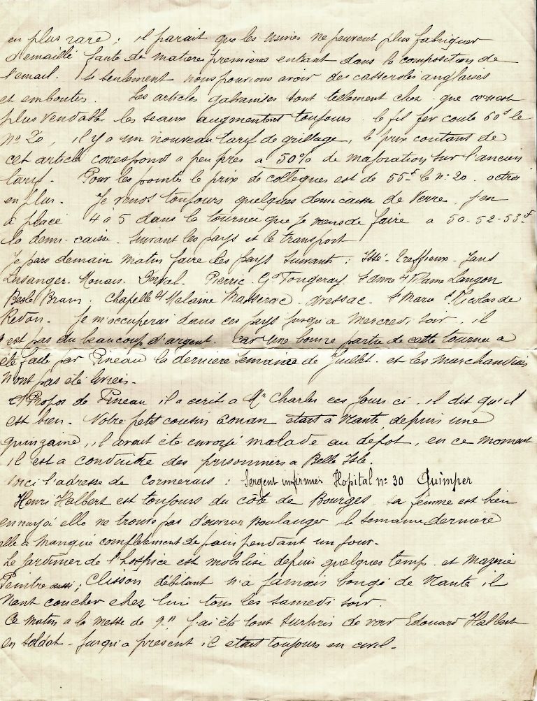 (f3) en plus rare ; il paraît que les usines ne peuvent plus fabriquer d’émaillé faute de matières premières entrant dans la composition de l’émail, si seulement nous pouvions avoir des casseroles anglaises et embouties. Les articles galvanisés sont tellement cher que ce n’est plus vendable les seaux augmentent toujours ; le fils de fer coûte 60 s le n° 20, il y a un nouveau tarif de grillage, le prix coutant de cet article correspond à peu près à 50 % de majoration sur l’ancien tarif. Pour les pointes le prix de collèges est de 55 F le n°20 octroi en plus. Je vends toujours quelques demi-caisses de verre, j’en ai placé 4 à 5 dans la tournée que je viens de faire à 50, 52, 53 F la demie caisse suivant les pays et le transport.