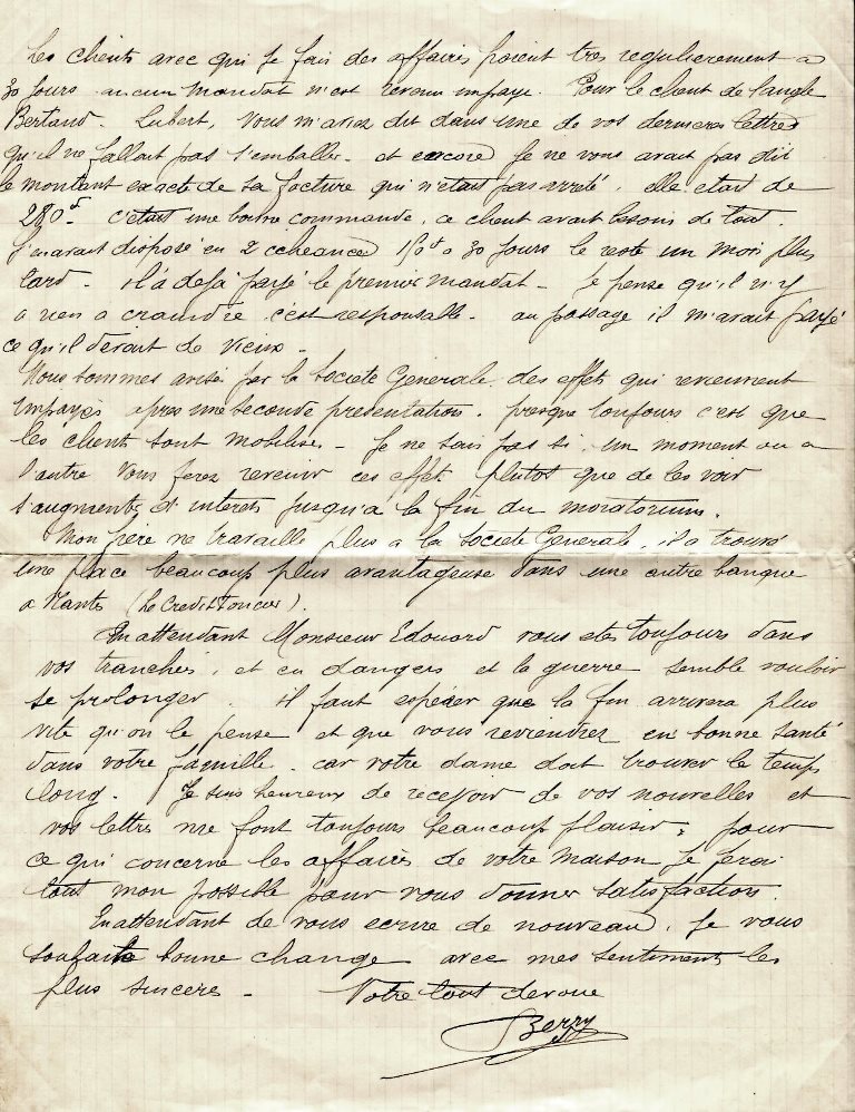 En attendant Monsieur Edouard vous êtes toujours dans vos tranchées et en danger et la guerre semble vouloir se prolonger, il faut espérer que la fin arrivera plus vite qu’on ne le pense et que vous reviendrez en bonne santé dans votre famille, car votre dame doit trouver le temps long. Je suis heureux de recevoir de vos nouvelles et vos lettres me font toujours beaucoup plaisir, pour ce qui concerne les affaires de votre maison, je ferai tout mon possible pour vous donner satisfaction.