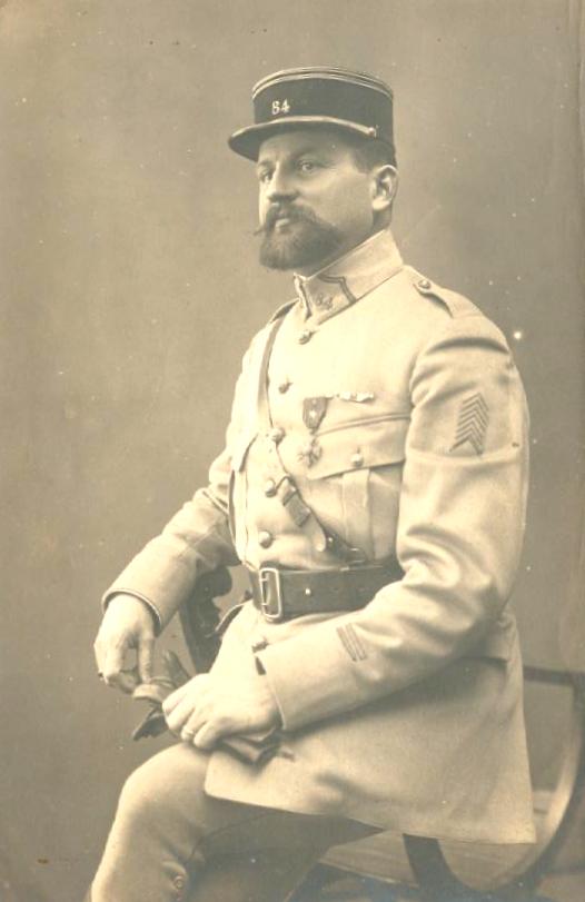 [la photo d’Edouard, assis, est un portrait après la guerre, chez le photographe Pervez, le professionnel. Cette photo était au mur en portrait dans la famille. La photo ci-dessus, avec le casque est prise au front]