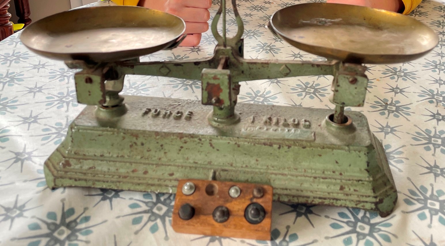 Lorsque la graineterie Haury a fermé, j’ai fait l’acquisition d’une de leurs balances Roberval. Je rêve en la regardant à mon ancêtre Jeanne-Françoise Moriceau qui l’utilisa sans doute avant.