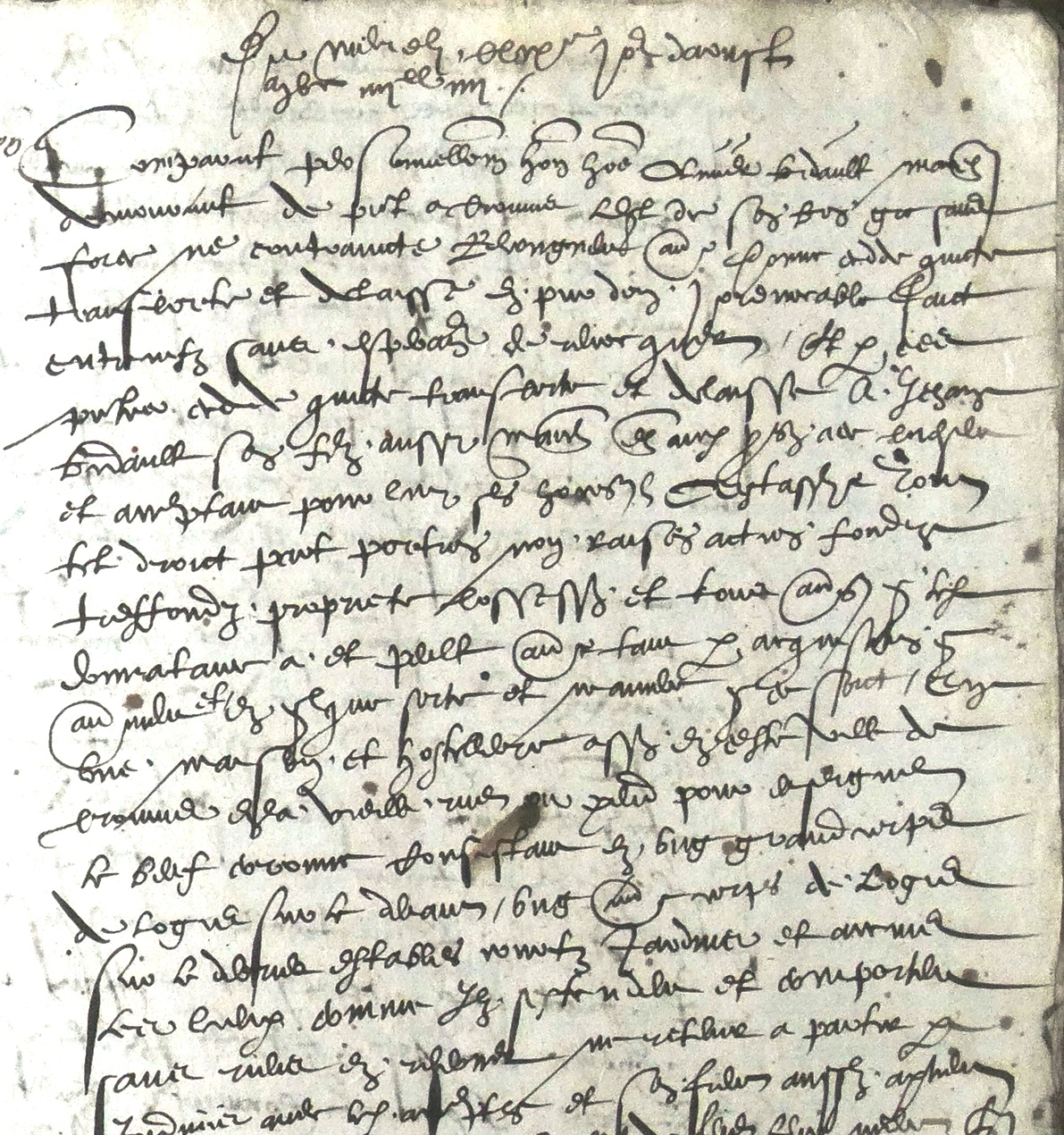 | 1584.08.29 vue 145 – Comparut personnellement honorable homme Olivier Bidault marchand demourant à présent à Provins lequel de son bon gré sans force ne contraincte recogneut avoir donné céddé quicté transporté et délaissé en pur don irrévocable fait entre vifs sans espérance de révocquer, et par ces présentes cèdde quicte transporte et délaisse à Jehan Bidault son fils aussi marchand demeurant audit Provins à ce présent et acceptant pour luy ses hoirs c’est à savoir tout tel droit part portion nom raison action fonds treffonds propriété possession et tous autres que ledit donataire a et peult avoir tant par acquisition que autrement en quelque sorte et manière que ce soit en une maison et hostellerie assise en ceste ville de Provins en la vieille rue ou pend pour enseigne le beuf couronné consistant en ung grand corps de logis sur le devant, ung autre corps de logis sur le derrière estables courts jardins et aireaux, les lieux comme ils se tiennent et comportent sans rien en réserver ne retenir