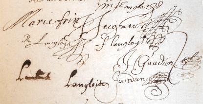 Retranscription de l’acte : Du 8 juillet 1659 avant midy devant nous Jean Marais notaire du comté de Laval et y demeurant ont esté présens et deuement estably Me Jullien Seigneur et Marie Frin sa femme, de luy suffisamment authorisée quant à ce, et François Langlois fils mineur yssu du premier mariage de ladite Frin avec deffunt François Langlois Sr de la Butte d’une part, et Michel Langlois Me architecte d’autre part, demeurantes lesdites partyes audit Laval, entre lesquelles partyes a esté fait l’allouement tel qui ensuit