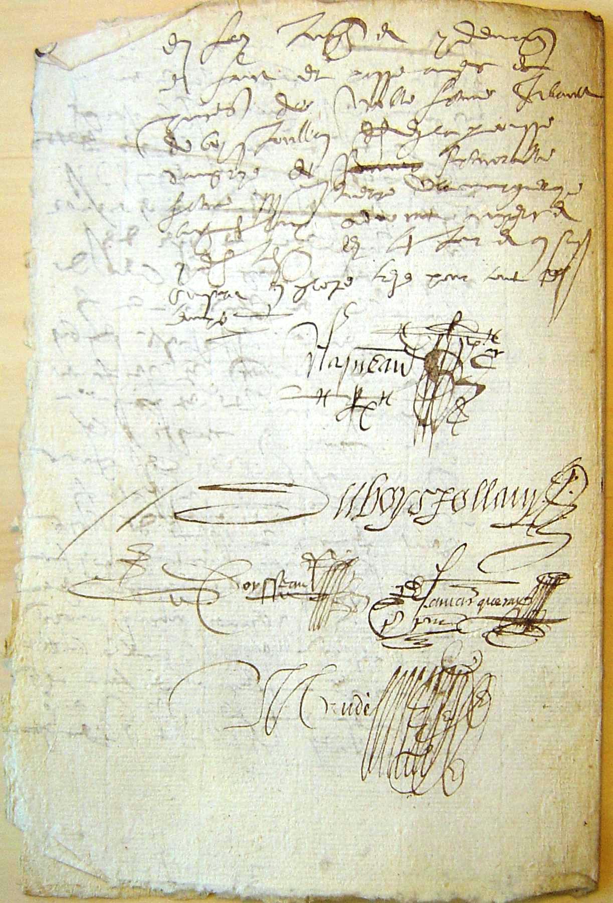 Le 22 mars 1607 avant midy, par devant nous René Serezin notaire royal à Angers fut personnellement estably Jehan Marcetz demeurant en la ville de Genesve au nom et comme procureur de Olivier Le Forbeur son beau père bourgeois de ladite ville de Genesve et de Charlotte Doiseau sa mère femme dudit Leforbeur comme il a fait apparoir par ratiffication de l’accord ci après spécifié soubz la cour de Genesve par devant Gabriel Patou, lequel audit nom a quité et quite noble homme Jehan Cupif sieur de la Felonaye, vénérable et discret Me François Cupif chanoine en l’église d’Angers, noble homme Claude Cupif recepveur des deniers du clergé et noble homme René Lepeletier sieur de Grignon son gendre de la somme de 600 livres tz qu’ils étaient solidairement obligés payer auxdits Le Forbeur et Doiseau sa femme en la ville de Lyon pour les causes portées par accord et transaction passée soubs nostre cour par devant Pierre Roger notaire d’icelle le 15 juillet 1605 (f°2) ratiffié par lesdits Le Forbeur et Doisseau …