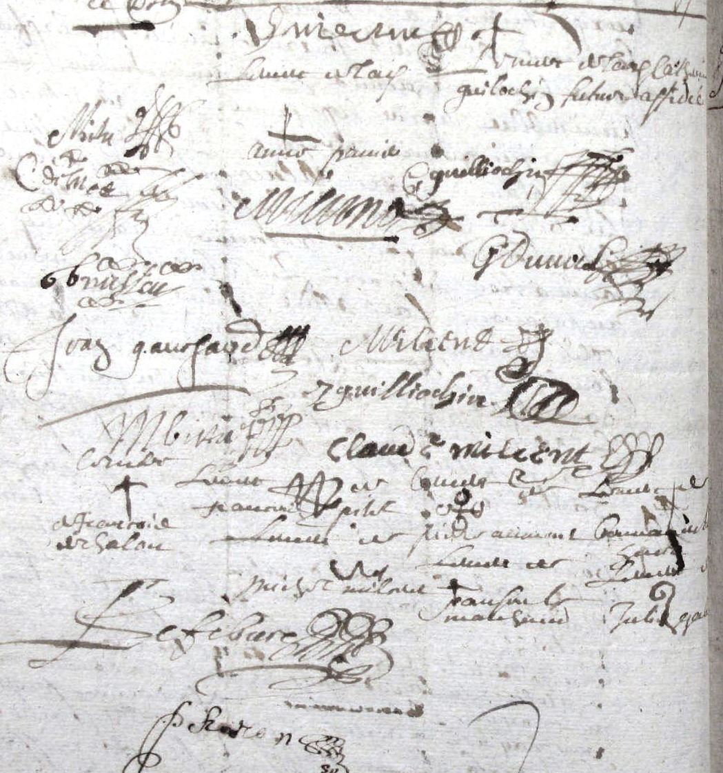 « Le 20 octobre 1633[1] au bourg et marché de la Fertay devant les tabellions dudit lieu de La Ferté Macé qui sont Pierre Durant (s) et Michel Ango (s), furent présents vénérable et discrète personne Me Pierre Guillochin (s) prêtre, Gervais (s) et Marin (s) Guillochin, Jehan Guillochin (s), Thomas Guillochin (s) Briantière, Jacques Milcent (m) et Thomas Chatel (s), Philipe Foutelais (s) Pichardière, Guillaume Heron (s) le Rocher, et Jehan Heron (s) Blestière, Jacques Ozenne Brigaudière (rayé donc non présent), Julien Provost (m), Pierre Jacques ? [je n’arrive pas à lire le nom, mais il signe] (s) et Louis Guillochin (m), tous parents et amis de l’enfant de defunt Thomas Guillochin Briantière… à la diligence et requeste de Jehan Huet Milcendière tuteur de ladite soubz, pour délibérer des vig… et nécessaires affaires d’icelle soubz – Premier sur les demandes de poursuite contre luy faites tant par Georges Picot, Robert Salles Gautrie comme ayant épousé la veuve dudit defunt mère de ladite soubz, ledit Foutelais Jacques Leboucher ; à savoir ledit Picot aux fins d’estre acquiter de la somme de 25 livres 12 sols 3 deniers de rente hypothéquaire (f°2) continuation et arrerages prorata frais et dépenses sur ce ensuivis tant contre ledit deffunt que contre ledit tuteur en viconté de Falaize, aux pleds de Briouze suivant la subrogation que ledit Picot en porte et fait dudit défunt qui sont sur ses deniers ; et pour ledit Salles aussi demandeur pour luy et au nom de sa femme [ce qui signifie que la veuve du défunt n’a pas encore recouvré ce qui lui est dû]… de ladite soubz pour la somme de 350 livres pour le dol assigné à sadite femme suivant le traité et sentence sur ce ensuivie aux pleds de Briouze ; et pour la requesete desdits Foutelais et Leboucher demandeurs de leur part à savoir ledit Foutelais la récompense de 3 années d’arrérages de 10 livres 14 sols de rente hypothéquaire moitié de 21 livres 8 sols qu’il a payées à Daniel Turget escuier sieur du Pont représentant son droit de la demoiselle du Bois … en quoi ledit défunt était obligé, auxquels ledit Foutelais et Leboucher, lequel Leboucher prétend s’en faire décharger disant qu’il à ce contraint que pour faire (f°3) plaisir audit défunt qui estoit obligé en la moitié de ladite rente selon la sentence et procès qui est pendant audit pleds de Briouze entre lui et ledit tuteur, tous lesquels parents après avoir eu communication du mémoire en forme de compte de la recepte et mises faites par ledit Huet tuteur, et de toutes les poursuites et demandes ci-dessus déclarées ce que ledit tuteur a juré et affirmé ne disposer d’aucun denier pour payer toutes lesdites demandes ; après lesdits parents avoir entre eux conféré sur le tout ont donné advis audit tuteur que pour éviter à la totale perte du bien de ladite soubz et un décret qui estoit préparé à faute de tout son bien, instance dudit Picot qu’il soit fait vente par ledit tuteur des maisons et héritage du village de la Chapronière appartenant à ladite soubz sans réservation ce que ladite vente soit fait sans condition audit Robert Salles … et ledit tuteur soit tenu et obligé appeler avec lui lesdits Me Pierre Guillochin et ledit Foutelais Gautrie et Thomas Guillochin pour y conserver les droits de ladite soubz pour en estre employer les deniers de ladite enfant et amortissement desdits 25 livres 15 sous de rente principal (f°4) arrérages et despends, lesquels despends ont été arbitrés avec ledit Picot à la somme de (blanc) et pour l’outre plus des deniers provenus de ladite vente seront employés à payer et acquiter les arrérages des autres rentes deues par ladite soubz … desquelles ledit tuteur en retirera acquits et amortissements desdits 25 livres 12 sols pour la décharge desdits parents … Témoins présents honnête homme Thomas Le Breton (s) de Magny et Julien Gautier (m) de Beauvain…