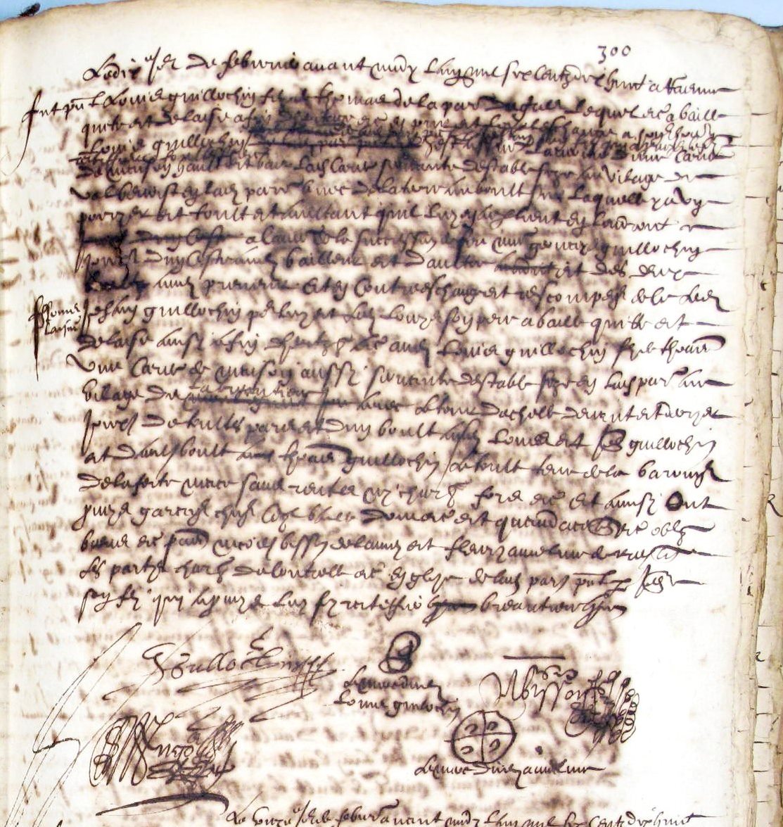« Le 27 août 1622[2] fut présent Thomas Guillochin (s) fils de Michel de la paroisse du Gres, lequel a subrogé Nicolas Lefevrier écuyer sieur de la Durandière présent à ce, c’est à savoir en son droit noms raisons et actions obtenir et poursuivre le fait et effet … contre Marin Clouet fils Robert pour faire … le constrat de vente qu’il luy a fait d’une portion de terre en prés paroisse de Faverolles jouxtant d’un costé et aboutant audit Marin Clouet et d’autre costé aux hoirs Julien Regnault fils Jean, et d’autre bout la rivière de Rouvre, et le remboursant … présents Jean Guillochin (s) fils de Louis et Thomas Guillochin (s) fils de Girard du Grès »