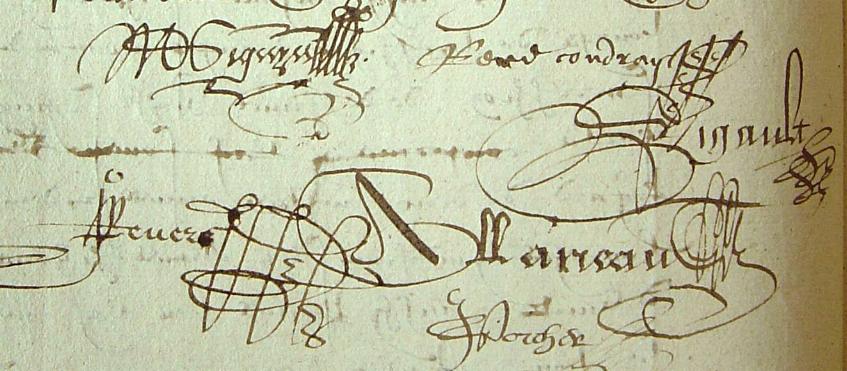 L’acte qui suit est extrait des Archives Départementales du Maine-et-Loire, série 5E8 – Voici la retranscription de l’acte : Le vendredi 30 mai 1608 après midy, par devant nous René Serezin notaire royal à Angers fut présente et personnellement establye Marye Seguin fille de défunts Vincent Seguin et de Jehanne Thibault femme de Pierre Belue ad ce présent et de luy autorisée par devant nous quant à ce, demourant en la paroisse de Vernies pays du Maine comme ils ont dit