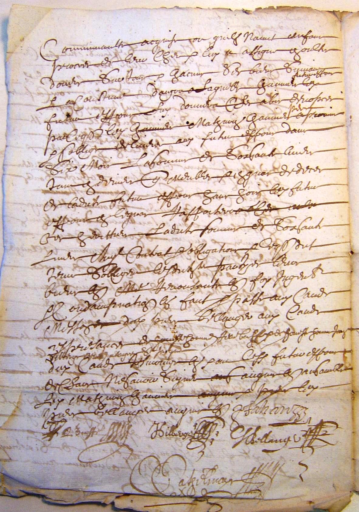 La procuration est le plus souvent attachée, et elle peut contenir une petite mention supplémentaire, aussi il est toujours intéressant de la retranscrire intégralement pour ne rien laisser passer : Le 25 janvier 1646 avant midy, davant nous René Goisbault notaire de la cour de Craon résidant au bourg de Saint Poix, furent présents et personnellement establiz et deument soumis, honorables personnes Me François Hardy sieur de la Masre, demeurant en sa maison de la Bonnaudière, paroisse de Saint Aubin de Pouancé, (cette précision ne figurait pas dans l’acte. La Bonnaudière est située tellement au nord de Saint Aubin qu’elle touche le bourg de Senonnes, lui même touchant le Maine et Loire de très près. Je savais par autre acte notarié que cette Renée Hardy était soeur de ce François Hardy Sr de la Mare, et qu’elle était aussi soeur de Guyonne Hardy épouse de Marin Grignon qui va suivre ici.) lequel a accepté et prorogé de nostre juridiction quant à ce, Guillemine Bellanger veufve de deffunt Jean Goussé vivant sieur de la Cocquerie, Renée Hardy veufve de deffunt Me Jullien Goussé vivant sieur de la Mehodière, tant en son nom que comme mère et tutrice naturelle des enfants mineurs issus dudit dudit deffunt Jullien Goussé et d’elle, Guyonne Hardy veufve de deffunt Marin Grignon vivant sieur de la Rouaudière aussi tant en son nom que comme mère et tutrice naturelle des enfants mineurs dudit deffunt Grignon et d’elle, Me François Goussé fils de ladite Renée Hardy tous lesquels demeurant audict Saint Poix tous lesquels solidairement sans division de leur personne et de biens leurs hoirs etc ont volontairement confessé avoir nommé et constitué par ces présentes ledit Me François Goussé et (blanc) leurs procureurs généraux et spéciaux pour prendre et emprunter de qui ils verront bon estre la somme de 300 livres tournois par une ou plusieurs obligations à cause de prest ou de constitution de rente les y obliger solidairement o les renonciations au bénéfice de division dit bénéfice de division discussion et ordre leurs deniers revenuz et employer partie d’iceux au paiement de la consignation que ladite Renée Hardy est tenue faire de la consignation di présidial d’Angers pour l’adjudication à elle faicte de certains héritages audit présidial d’Angers le (blanc) dernier, et le reste et surplus d’iceux deniers ledit François Goussé les recevra pour et aux fins les faire tenir et met-tre en les mains desdits constituants, bailler lettres d’indemnité à iceluy ou ceux qui s’obligeront avec et en la compagnie desdits constituants, avec promesse de les tirer et mettre hors de leurs interventions et obligation dedans tel qu’il leur plaira et généralement promettant mesme ratiffier le contrat ou obligation toute fois et quantes que besoing requi sera, ce que ledites parties ont ainsy voulu consenty stipulé et accepté par ces présentes, et généra-lement etc.. fait et passé audit Saint Poix maison de nous notaire en présence de Me Gabriel Gendry prêtre demeurant au bourg de Méral et Me René Dezestre aussy prêtre demeurant audit Méral tesmoins à ce requis et appelez, lesquelles Bellanger et Renée et Guyonne Hardy ont dict et déclaré ne savoir signer enquizes.
