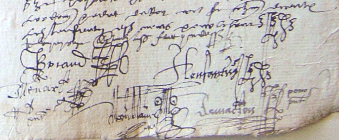 Le 31 décembre 1513 en la cour du roy notre sire à Angers (Cousturier notaire) establys Denis Lenfantin paroissien du Lyon d’Angers et Jehan Hamelin de ladite paroisse soubzmectant etc confessent avoir vendu et octroyé et encores vendent etc à honorable homme et saige Me Pierre de Landevy licencié en loix sieur de la Perrière [Le Louroux-Béconnais, mais sans plus in C. Port] qui a achavté pour luy ses hoirs etc scavoir est ledit Lenffantin demye hommée de pré ou environ sise en la prairie du Puyz des Loges en ladite paroisse du Lyon joignant d’ung cousté au pré dudit sieur de la Perrière et d’autre cousté au pré pré Jacques Garreau abouttant d’un bout à la terre des héritiers feu Jehan Duboys et d’autre bout à la terre de Jehan Hamelin, ou fié de la Roche au Felle et tenu dudit lieu à 2 sols tz de cens rente ou devoir pour toutes charges, et ledit Jehan Hamelin ung quart d’hommée de pré ou environ en ladite prée du Puyz des Loges joignant d’un cousté au pré dudit Jacques Garreau qu’il acquist de Guillaume Picault et d’autre cousté au pré des héritiers dse Gaulteliers aboutté d’un bout au pré dudit Garreau qui l’a acquis de Mathurin Lepentoux et d’autre bout au pré des héritiers feu Jehan Duboys du pré, ou fié de la Roche au Felle et a franc devoir et sans aucune chose en payer par ledit achateur ; transporté etc et est faire ceste présente vendition pour le prix et somme de 60 sols tz pour ledit Hamelin et pour ledit Lenffantin pour la somme de 100 sols tz payés le tout content en notre présence et à veue de nous par ledit achacteur audit vendeur … et dont etc et en ont quicté etc à laquelle vendition et tout ce que dessus est dit tenir etc et lesdites choses vendues garantir par lesdits vendeurs etc obligent etc eulx et chacun en tant que luy touche leurs hoirs etc renonçant etc foy jugement et condemnation etc présents à ce Me Estienne Parot et Jehan Duboys de Neufville »