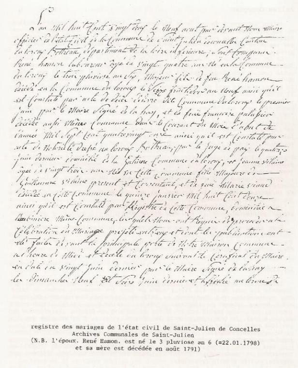 J’ai trouvé l’acte qui suit est aux Archives du Maine-et-Loire, série 5E5 – Voici ma retranscription : Le 17 janvier 1608 par devant nous Guillot notaire royal Angers fut présent en sa personne honneste homme Laurent Thavenot sieur de Villedé demeurant au bourg de St Julien de Concelles diocèse de Nantes et estant de présent en ceste ville tans en son nom privé que pour et au nom et se faisant fort de Françoise Boucher sa femme à laquelle il a promis et demeure tenu faire ratiffier et avoir pour agréable ces présentes et la faire obliger solidairement avec lui à les renonciations requises et en fournir lettres de ratiffication vallables dedans d’huy en ung mois prochain à peine de toutes pertes ces présentes néanmoins