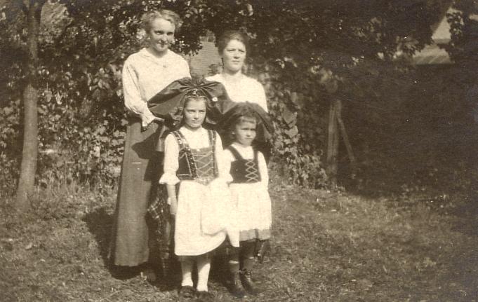 [photo 1917, devant la vitrine de la quincaillerie rue Saint-Jacques à Nantes. Les femmes, voutées avant l’âge, portent le deuil, habillées de noir, y compris le voile noir. A gauche Aimée Guillot, belle-mère d’Edouard Guillouard. Elle a seulement 70 ans ! Elle écrit alors le cahier que vous lisez. Elles gardent leurs petits enfants. Celui du milieu, Robert, porte casquette militaire et fusil. Cette photo est la plus impressionnante que je possède. Elle impressionnait même ma maman, décédée à 83 ans encore jolie femme, surtout pas ratatinée et voutée et couverte de voiles noirs. Et aujourd’hui, en 2022 je vais avoir 84 ans, et je ne ressemble en rien à ces vieilles voutées, mes 2 arrière grand mères, même si je loin d’être belle ! NOUS VIEILLISSONS AUJOURD’HUI MIEUX QU’AUTREFOIS !!!]