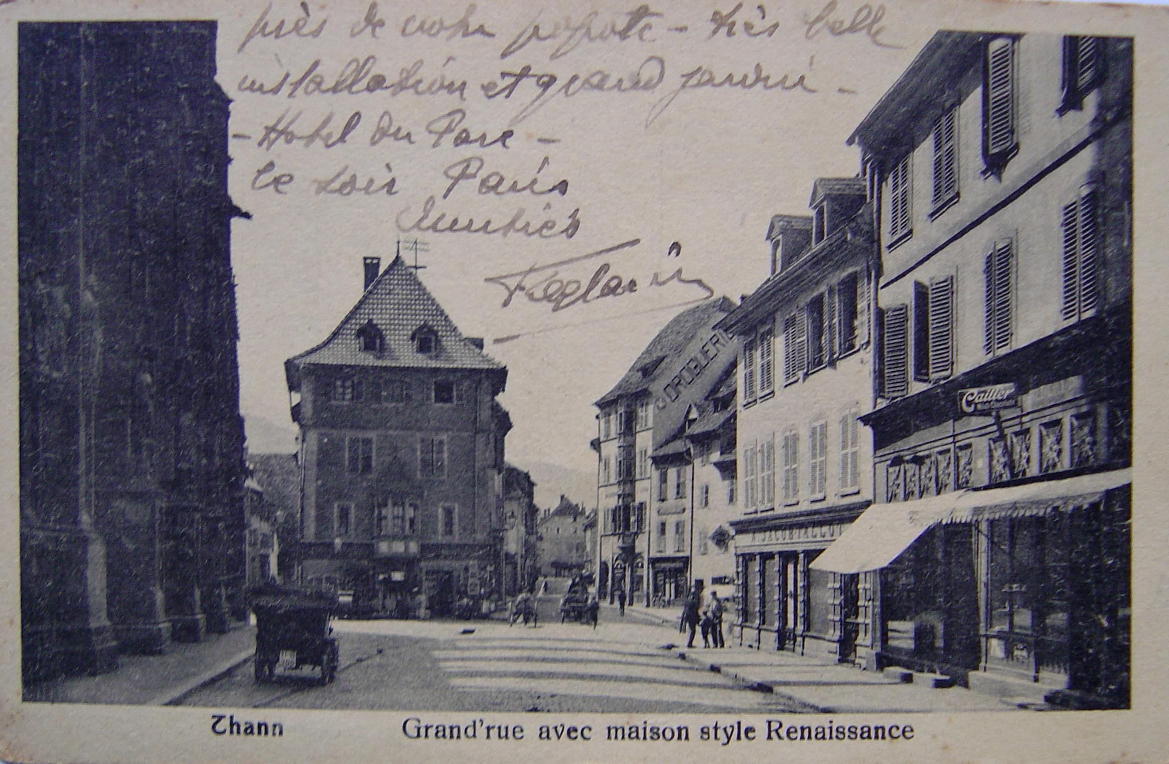 Carte de Leglaive à Edouard (après la guerre) « Mon cher lieutenant, je ne peux quitter l’Alsace sans vous adresser un salut cordial de cette terre arrosée de votre sueur et même un peu de votre sang. L’excursion de dimanche à l’Hartmann fut intéressantes, mais vers 4 h au sommet un orage de 1ère grandeur nous attendait, n fin de journée mes pieds pouvaient croire que la guerre recommançait. Puis j’ai passé 2 jours à Thann, ville toujours accueillante, Rien ne reste des belles défenses dont nous étions si fiers et qui protégaient si bien la vallée de la Thur. Les anciens propriétaires de l’Ours Blanc ont transformé en hôtel une grande villa située près de notre popote, très belle installation, grand jardin, Hôtel du Parc. Ce soir Paris, Amitiés. Leglaive »