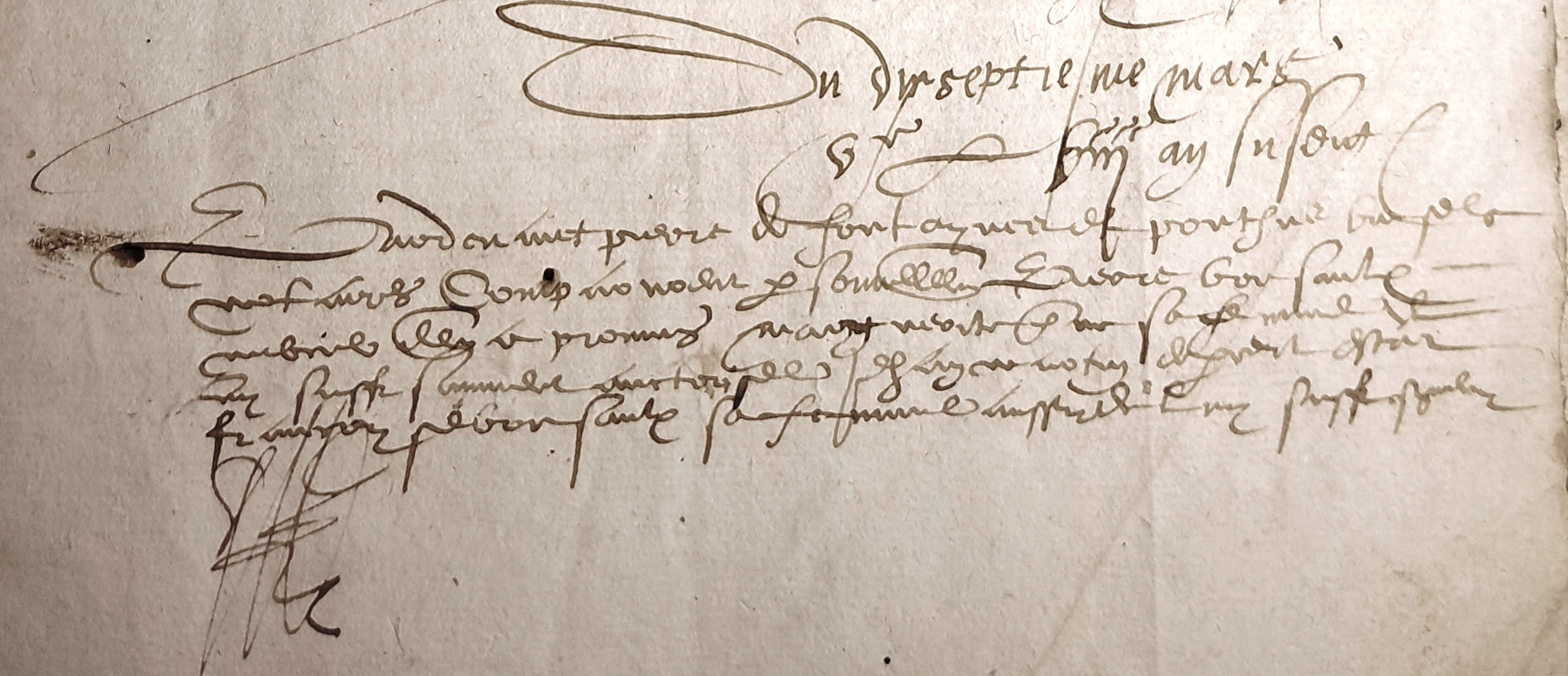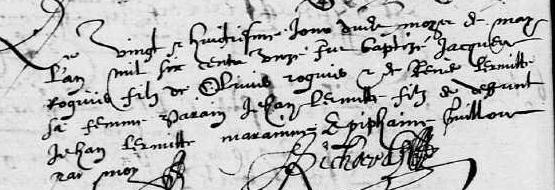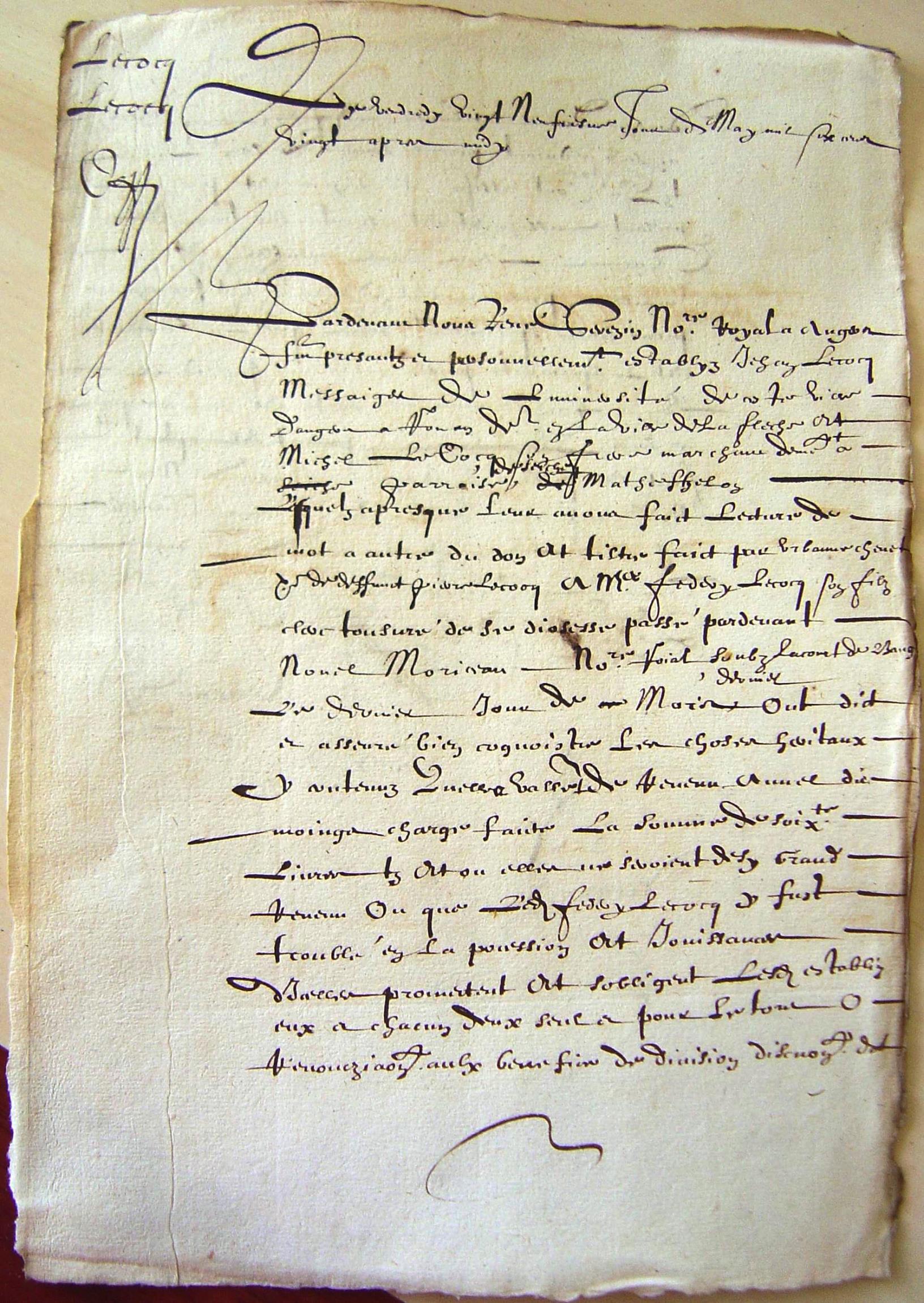 Il était marchand devant le même notaire en 1626 sur son contrat de remariage. En 1597, l’acte ci-dessous le donne témoin de cette importante transaction en forme de cession foncière, et il est laboureur. Il n’apparaît dans aucun des bornages des pièces de terres cédées par le couvent Saint Ayoul, par contre j’y rencontre un proche des ascendants de Jules Verne, dont je vous reparlerai.