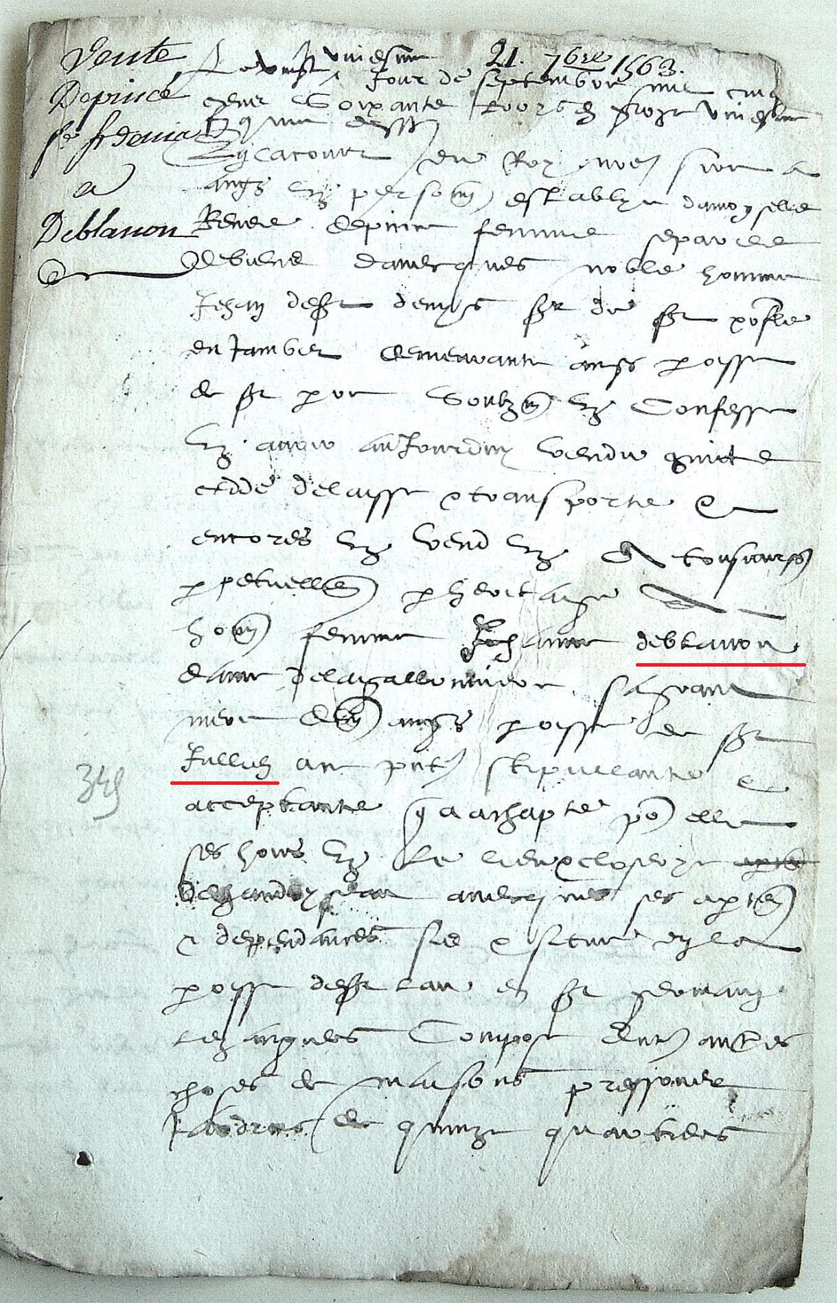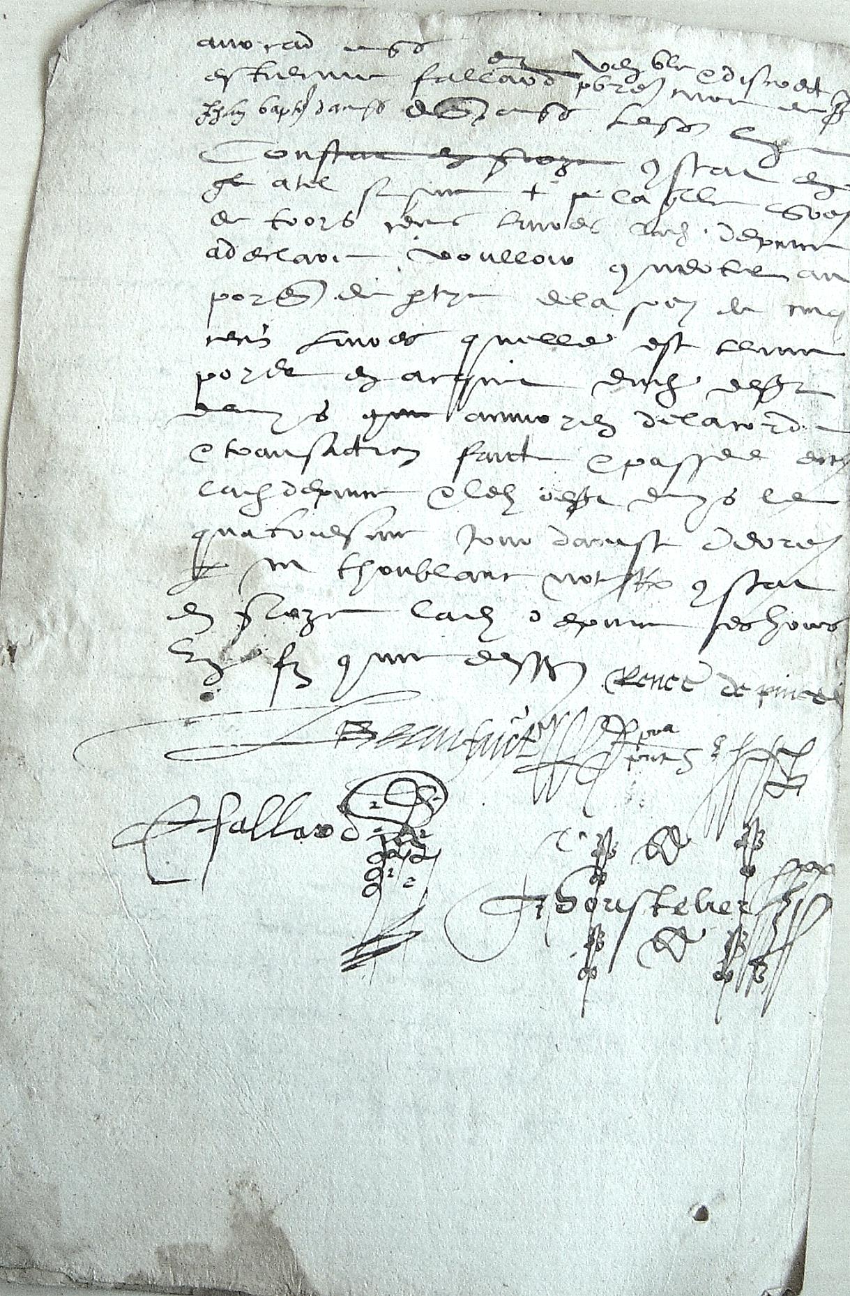 Le 9 mars 1626 avant midy, par devant Louys Couëffe notaire roial à Angers furent présents establis deuement soubmis hault et puissant seigneur Messire Samuel d’Apelvoisin chevallier seigneur de Brebaudet Linvernière Taillepied la Jouannière la Febretière Villepeau l’Espine etc demeurant ordinairement en sa maison de la Jouannière paroisse de Fercé pays de Bretagne évesché de Rennes, et Phelippes de Hirel escuyer sieur de la Hée demeurant en ceste ville paroisse de la Trinité et honnorable homme Mathurin Doucher marchand demeurant aussy en ceste ville paroisse St Michel de la Pallu, lesquels chacun d’eulx seul et pour le tout sans division de personnes ne de biens leurs hoirs etc confessent avoir ce jourdhuy vendu créé et constitué et encores vendent créent et constituent par hipotheque général et universeil et,promis prometent garentir fournir et faire valloir tant en principal que cours d’arrérages à honnorable homme Pierre Davyau marchand et Phelippes Dupille son espouse demeurant audit Angers paroisse St Maurille à ce présent et acceptant et lesquels ont achapté et achaptent pour eux et leurs hoirs etc la somme de 50 livres tz de rente hippothéquaire annuelle et perpétuelle payable et rendable franche et quite (f°2) par lesdits vendeurs leurs hoirs etc auxdits acquéreurs leurs hoirs etc en leur maison en ceste ville à pareil jour et datte des présentes premier payement commensant d’huy en un en prochainement venant et à continuer etc, laquelle somme de 50 livres de rente lesdits vendeurs solidairement comme dit est ont dès à présent et par ces présentes assise et assignée assient et assignent généralement sur tous et chacuns leurs biens meubles immeubles rentes et revenus quelconques présents et futurs … etc…