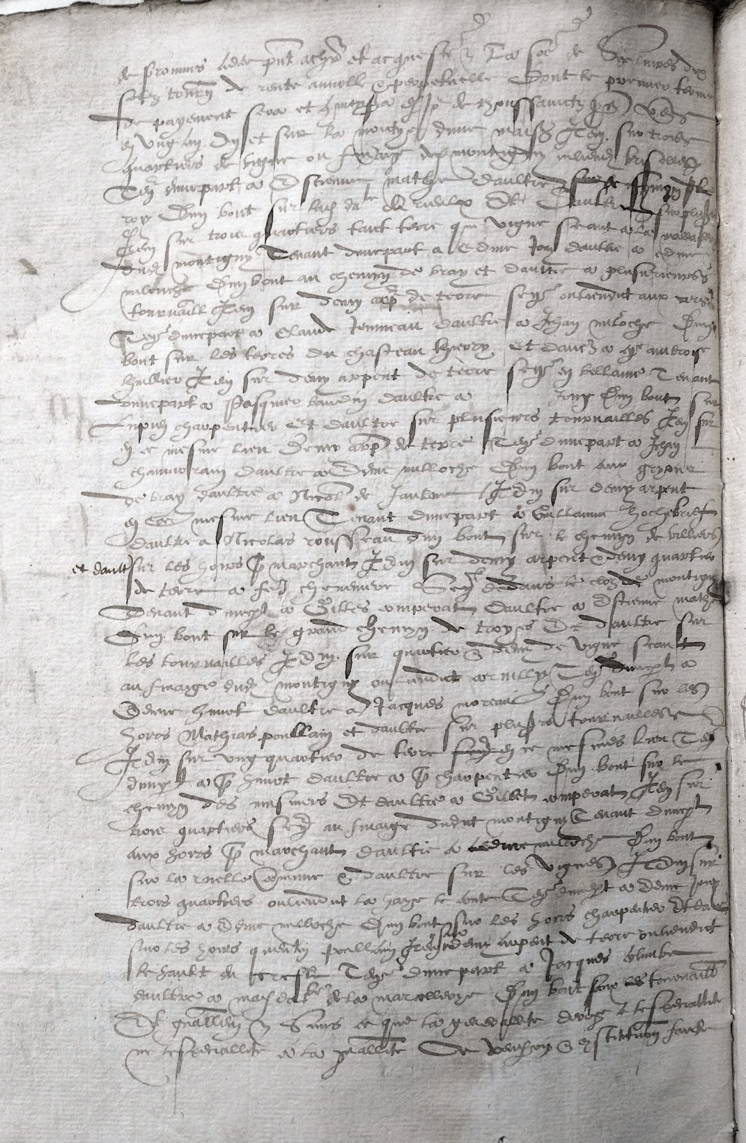 AD77-260E290 Pierre de Fontaines notaire royal à Provins – 1559.10.23 vue 10 – fut présent en sa pesonne François Poullain laboureur demeurant à Montigny le Guesdier lez Bray sur Seyne lequel de son bon gré sans force regognut et confessa avoir vendu constitué assis et assigné et promis garantir paier fournir par chacun an le jour de feste de Thoussaints à tousjours à honorable homme Jehan Marchand bourgeois (f°2) de Provins ad ce présent achapteur et acquereur la somme de 6 livres 10 sols tournois de rente annuelle et perpétuelle dont le premier terme de payement sera et commencera le jour de Thoussaints prochainement venant en ung an, en et sur la moityé d’une maison – Item sur 3 quartiers de vigne au finage dudit Montigny au lieudit Brisolles tenant d’une part à Serenne Mathe d’aultre Saingy Leroy d’un bout sur ladite damoiselle de Rieulx et d’altre sur plusieurs – Item sur 3 quartiers tant terre que vigne sis à la Mallardière dudit Montigny tenant d’une part à Edmé Jouy et d’autre à Edmé Milonche d’un bout au chemin de Bray et d’autre à plusieurs tournailles – Item sur demy arpent de terre sis au lieudit aux Carpes ? tenant d’une part à Claude Jounneau d’autre à Jehan Miloche d’ung bout sur les terres du Chasteau Thierry et d’autre à Me Ambroise Houllier – Item sur demy arpent de terre sis en Bellaine tenant d’une part à Pasquier Baudin d’aultre à (blanc) Jouy d’un bout sur Lupin Charpentier et d’aultre sur plusieurs tournailles – Item sur le mesme lieu demy arpent de terre tenant d’une part à Jehan Channurain d’aultre à Denis Milloche d’un bout aux Gryons de Bray d’aultre à Nicolas De Janlane – Item sur demy arpent en ce mesme lieu tenant d’une part à Guillaume Hochebref d’aultre à Nicolas Rousseau d’un bout sur le chemin de Villiers et d’aultre sur les hoirs Jehan Marchant – Item sur demy arpent demy quartier de terre à faire chenevière situés dans le clos de Montigny tenant d’une part à Gilles Comperat d’aultre à Estienne Mathe d’un bout sur le grand chemin de Troyes et d’aultre sur les tournailles – Item sur quartier et demy de vigne sis au finage dudit Montigny au lieudit Cornilly tenant d’une part à Edmé Hunot d’aultre à Jacques Moreau d’un bout sur les hoirs Mathias Poullain et d’aultre sur plusieurs tournailles – Item sur ung quartier de terre en ce mesme lieu tenant d’une part à Jehan Hunot d’aultre à Jehan Charpentier d’un bout sur le chemin des misniers et d’aultre à Gillette Comperat – Item sur 3 quartiers sis au finage dudit Montigny tenant d’une part aux hoirs Jehan Marchant d’aultre à Edmé Milloche d’un bout sur la ruelle commune et d’aultre sur les vignes – Item sur 3 quartiers au lieu dit la Haye le Bute tenant d’une part à Denis Jouy d’aultre à Denis Milloche d’un bout sur les hoirs Charpentier et d’aultre sur les hoirs Quentin Poullain – Item sur demy arpent de terre au lieu dit le Haut de Crosle tenant d’une part à Jacques Glambe d’aultre à mademoiselle de la Marcellerye d’un bout sur les tournailles et généralement sans ca que la généralité déroge à la spécialité ne la spécialité à la généralité ; cette vendition set constitution faite (f°3) moyennant la somme de 80 livres tournois argent francaudit vendeur qui présentement luy ont esté payés en douzains