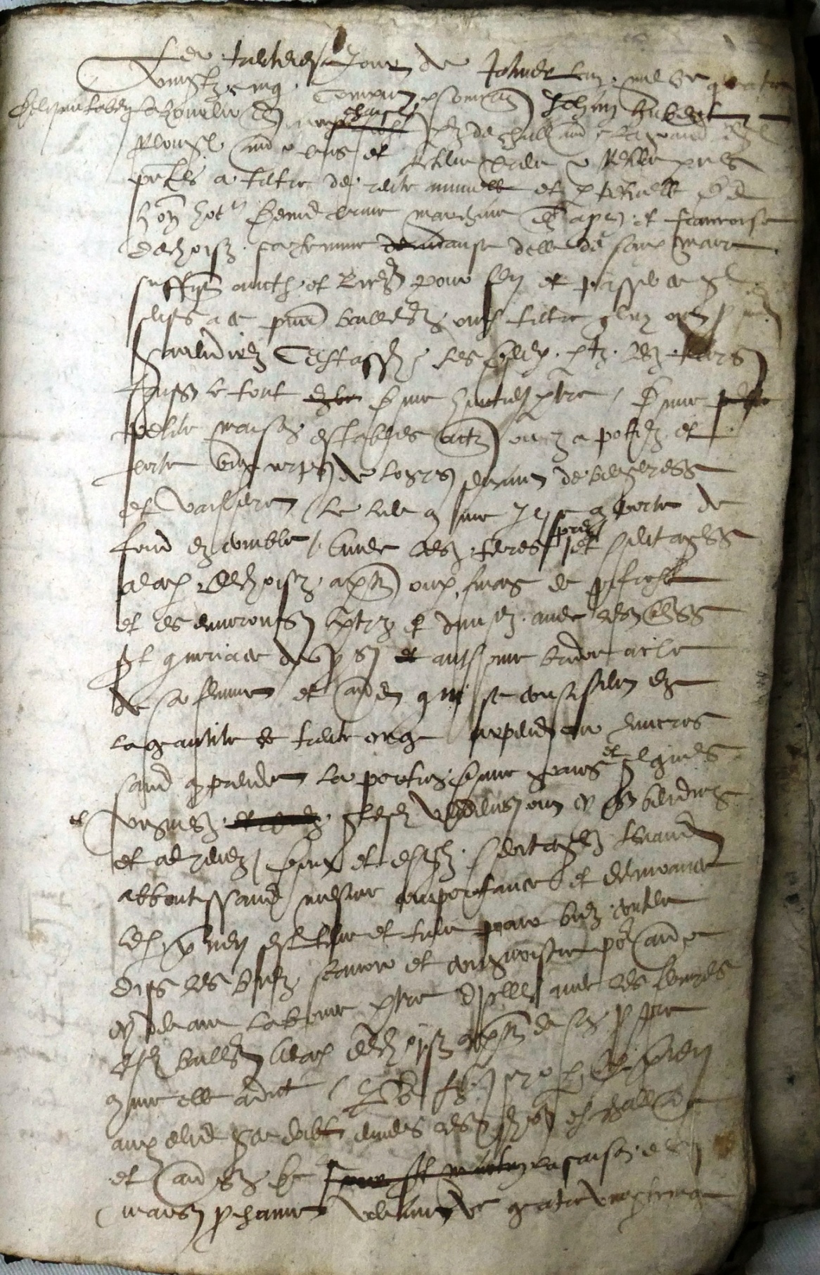 1585.01.30 vue 242 – comparut personnellement Jehan Hubert laboureur demeurant à Chaises paroisse de Challautre la grand lequel recogneu avoir pris et retenu prend et retient par ces présentes à tiltre de rente annuelle et perpétuelle d’honorable homme Denis Privé marchand demeurant à Provins et Françoise Dechoisy sa femme à cause d’elle de sondit mari suffisamment auctorisée et licenciée pour faire et passer ce qu’il s’ensuit à ce présents bailleurs audit tiltre qui luy ont promis garantir c’est à savoir les deux parties les troys faisant le tout d’une huitiesme partie d’une petite maison estables attenantes ou il y a potiez et porte ung corps de logis servant de bergeries et vailere, le lieu comme il se comporte de fond en comble, avec ses terres prés et héritages à ladite Dechoisy appartenant au finage de Prefrost et es environs à partager et diviser avec les religieux de St Quiriace de Provins et Anthoine Bridou à cause de sa femme et autres qui se consistent en la quantité de 35 arpents ou environ sans comprendre la portion d’une grange et quelques vignes que lesdits vendeurs ont déjà vendus et aliénez deux desquels héritages tenans abboutissans mesme comportance et demourance ledit preneur s’est tenu et tient pour bien content disant les bien savoir et cognoistre pour avoir cy devant labouré partie d’icelle, que les fermyers desdits bailleurs à ladite Dechoisy appartenant de son propre comme elle a dit, pour en jouyr par ledit preneur … et autres de la saison de mars prochainement venant 1585 (f°2) à tousjours perpétuellement, moyennant et pour le prix et somme de 18 escuz d’or sol qui sont 54 livres tz de rente annuelle et perpétuelle et de fond et bail que ledit preneur a promis et promet est et sera tenu doresnavant bailler et payer auxdits bailleurs leurs hoirs ou le porteur au jour de feste st Martin diver premier terme de paiement commançant dudit jour prochain en ung an et ainsi en continuant d’an en an audit jour à tousjours, sur lesdits héritages baillés qui en sont et demourent spéciallement chargés loyés obligés ypothéqués et asservis, et lesquels il sera tenu entretenir ladite maison bien manable et habitable et lesdites terres en bon estat de labour et en saisons deubs et convenables comme … sur tous autres biens et héritages … (f°3) rachapt et extinction d’icelle pour la somme de 800 livres tournois …