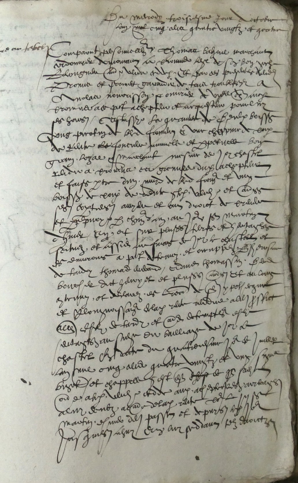 | 1584.10.03 vue 155 – Comparut personnellement Thomas Bahoul marchant cordonnier demourant à Provins lequel de son bon gré recogneut avoir vendu ceddé et par ces présentes vend et promis et promet garantir de tous troubles à Nicolas Nourisson ouvrier de viel deumeurant audit Provins présent acceptant et acquesteur pour luy ses hoirs c’est à savoir la quantité de 2 boisseaux ung perrotin de bled froment et une choppine de rente foncière annuelle et perpétuelle bon grain loyal et marchant mesure de Joy Chastel rendu à prorata es greniers dudit achepteur et faisant partie d’un muyd de bled froment et ung boisseau de poix de rente par ledit vendeur et autres ses cohéritiers avoyent et ont droit de prendre et percepvoyr par chacun an au jour st Martin d’hiver en et sur plusieurs terres et héritages situés et assis au finage de jouy le Chastel et es environs à présent détenus et occupés par Jerosme Detardy Thomas Evrard Edmé Thomassin Denis Boucher dit Hervyet et plusieurs autres et au long contenus et déclarés es lettres de sesdites ypotheques et recognoissances de ladite rente reneue à leur proffict à l’encontre dudit Detardy et autres détempteurs desdits héritages au siège du baillage de Jouy le Chastel en dacte du quatriesme jour de juillet l’an mil cinq cens quatre vingts et ung siné Bijot et Chappelle et outre a ledit vendeur ceddé audit achepteur les arrérages à luy deubs à cause de ladite rente pour le jour st Martin d’hiver dernier passé et depuys leditjour jusques à huy … (f°2) … ceste vente faite moyennant le prix et somme de 6 écuz d’or sol argent franc audit vendeur … |