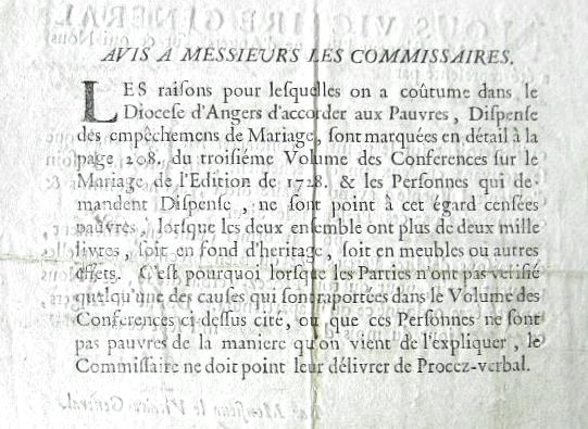 Cette dispense mérite que nous arrêtions un peu sur le seuil de fortune accepté pour ne pas envoyer en cour de Rome. En effet, la même année 1733, voici le billet que le vicaire général adressait aux curés concernés par une dispense.