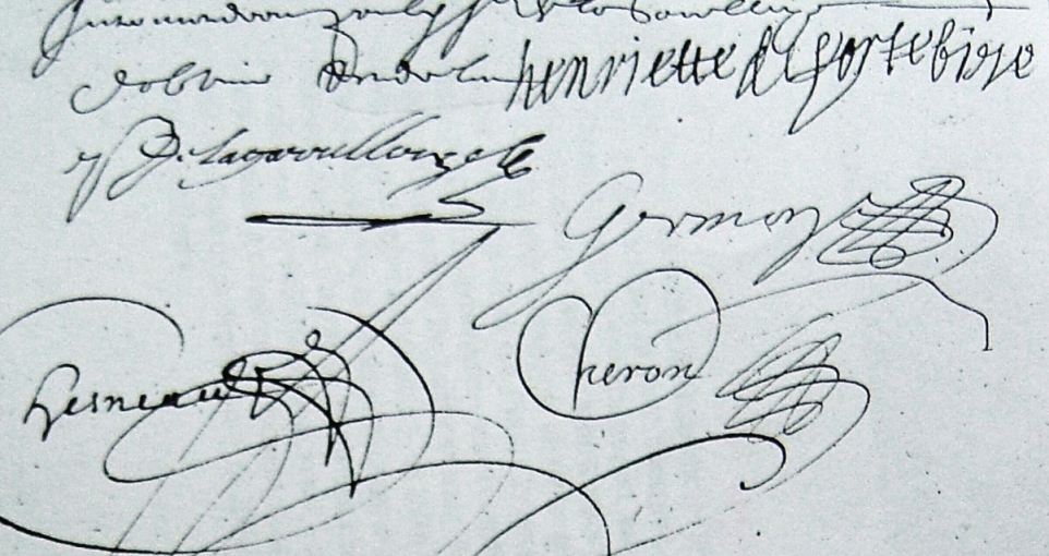 Le 4 juillet 1644 avant midy, par devant nous Nicolas Chesneau notaire royal à Angers furent présents personnellement establis et soubzmis damoiselle Henriette de Portebize veuve de deffunt Philippe Du Hiret écuyer sieur de la Hoyée, soy disant donataire et créantière dudit deffunt demeurante au Tertre St Laurent paroisse de la Trinité de ceste ville, et se faisant fort de Jean de Ballodes écuyer sieur de la Rachère mari de damoiselle Elye Du Hiret, et damoiselle Renée Du Hiret veuve de deffunt Nicolas Le Gouz écuyer sieur du Bois Zougard et Pierre Du Hiret écuyer sieur de la Bissachère, et encore de tous les héritiers maternels de sondit deffunt mari auquels ils promettent faire ratiffier dans quinzaine ou faire aparoir qu’elle soit subrogée en leurs droits d’une part, et noble homme Pierre de la Garellerye mari de damoiselle Françoise Du Hiret aînée et principale et noble héritière dudit deffunt Philippe Du Hiret, demeurant à la Verye province de Bretaigne paroisse de Soudan d’autre part, lesquels pour terminer tous procès pendants différends meus et à mouvoir entre eulx pour raison de tous et chacuns les droits par eulx respectivement prétendus en la dite succession tant de l’estoc paternel que maternel, s’oblige ladite de Portebize de faire lever les saisyes qui sont sur les biens de ladite succession, à cause et pour raison des debtes dudit deffunt et d’elle par ceulx qui viendront cy après et faire cesser les causes, et mettre les papiers et titres concernant ladite succession entre les mains dudit sieur de la Garellerye en présence d’arbitres desquelz il luy donnera acte bon et vallable et fourniront lesdits establis respectivement leurs demandes et déffences 15 jours après le fournissement de la ratiffication desdits héritiers que ladite de Portebize fournira, sur lesquelles productions les arbitres rendront leur sentence dans la fin du moys d’aoust prochain, et pour et au regard des biens de ladite succession, ladite de Portebize en jouira fors et excepté de la terre noble de la Verye ses appartenances et dépendances, ladite terre située en la paroisse de Soudan, composée de fief métayrie bois et dixmes, de laquelle ledit Garellerye jouira, à la charge par ledit de la Garellerye d’entretenir la métairie de Landasson comme ladite damoiselle de Portebize en a fait, et pour le regard de la métayrie de la Verrye ledit Garellerye sera tenu d’obéir à la sentence de reingrande donnée au siège présidial ce ceste dite ville entre lesdits métayers et ledit Garellerye, et jouira de ladite terre de la Verrye jusques à la sentence arbitrale définitive ; et pour le regard desdits mestayers de la Verrye ladite damoiselle de Portebize fait le fait vallable pour eux et promet le faire ratiffier dans 15 jours ; pour terminer les différends que plusieurs autres ensemble pour raison des saisies que ledit Garellerye a fait faire sur eux, et ledit Garellerye promet leur rendre les bestiaux ou faire rendre aux gardiatairex, lesquels bestiaux luy demeureront offerts pour les causes desdites saisies sans que lesdits métayers en puissent divertir de sur ledit lieu de la Verrye ; et au cas que lesdits mestayers les voulussent amener ailleurs sera permis audit Garellerye de le faire arrester ; et oultre c’est obligée ladite damoiselle de Portebize de payer le gardiataire des bestiaux 8 jours après la restitution que les arbitres pouroient ordonner ; et pour terminer lesquels différends ont convenu d’arbitres de Me Laurent Gault et Me Sébastien Valtaire leurs advocats et conseils et de Me René Hamelin sieur de Richebourg et pour greffier dudit arbitrage ont convenu de Me Pierre Royer et lad. sentence quy sera donnée par lesdits arbitres sera exécutée nonobstant opposition ou apellation quelconque de lad. Portebize, lesquelles partyes promettent agir et obéir comme sy est ou estoit signé par nos seigneurs de la cour de parlement a peine de 1 000 livres tz, ce qu’ils ont respectivement stipulé et accepté, et à ce tenir et aux domages etc s’obligent lesdites partyes l’une vers l’autre leurs hoirs etc et biens meubles et immeubles présents et à venir à prendre vendre etc renonçant etc dont etc fait en nostre tabler présents Jean Gernon et Jo… Cheron praticiens audit Angers, et outre lesdites parties tiendront compte l’une l’autre de ce qu’ils auront jouy et prins, et promet ledit Garellerye faire ratiffier la présente à sa femme dans ledit jour de Sr Laurent, passé devant la cour de cette ville et ceux qui interviendront pour ledit sieur de la Garellerye d’obtenir un delai signé Henriette de Portebize, J. de la Garrelerye, Gernon, Chesneau, Cheron Montré le compromis aux arbitres cy dessus nommés quy l’ont accepté et jugé au désir d’iceluy le dernier jour d’aout prochain an 1644 Signé R. Hamel, Valtère, [ Jamet]