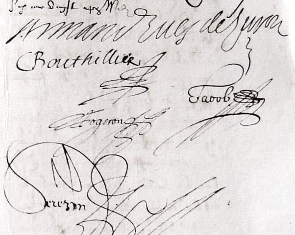 Le samedi 22 février 1620, par devant nous René Serezin notaire royal à Angers furent présents et personnellement establis messire Claude Boutiller (signe « Bouthillier ») conseiller du roy en ses conseils d’état, estant de présent en ceste ville, lequel a recognu et confessé que les 40 000 livres tournois pour lesquelles révérend père en Dieu missire Sébastien Chauvet evêque de Langres duc et pair de France, lui a vendu et constitué la somme de 2 000 livres tz de rente hypothéquaire par contrat passé par devant Pierre Guilliard et Mathieu Bontemps notaire au chastelet de Paris le 23 janvier 1617 luy furent baillés et délivrés pour cest effet par messire Armand Jehan du Plessis de Richelieu évêque et baron de Lusson, à ce présent, lequel a aussi recognu que les 18 000 livres tz que ledit sieur Boutiller a receuz dudit sieur évêque de Langres en déduction (f°2) des 40 000 livres il luy en a baillé les acquits en sorte qu’il s’en tient content et partant iceluy sieur Boutiller a renoncé et renonce audit constrat de constitution de rente pour et au profit dudit évêque de Lusson pour se faire payer du surplus tant en principal que arrérages deubs et eschuz et qui ont cours cy après à ses périls et fortunes ainsi qu’il verra estre à faire et à ceste fin en tant que besoing est ou seroit luy en fait cession et transport, sans aulcune garantie ne restitution de deniers, comme n’ayant pris et accepté ledit contrat en son nom qu’à la prière et requeste et pour faire plaisir audit seigneur de Lusson auquel il a baillé et mis en mains la grosse qu’il en avoit, ainsi qu’il l’a recogneu et accepté ce que dessus pour luy ses hoirs (f°3) et à ce tenir etc dont etc fait et passé audit Angers maison dudit seigneur évêque en présence de Me Nicolas Jacob et Jacques Rogeron.