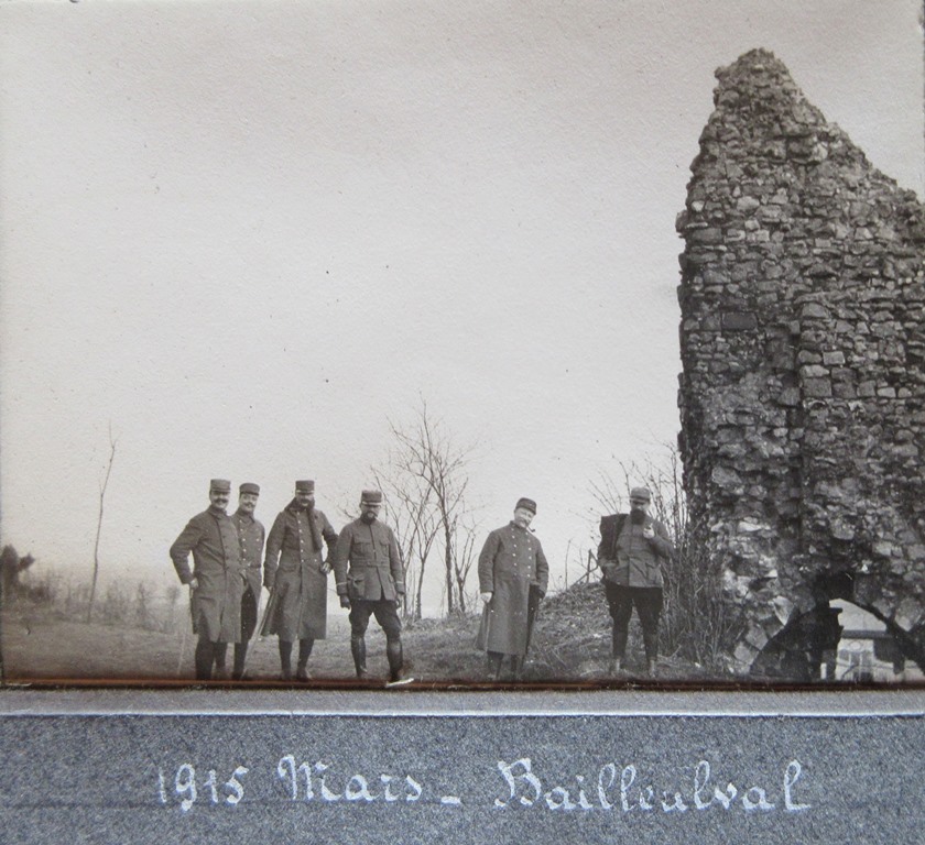 « mars 1915, Bailleulval, intérieur de la tour ». En agrandissance cette photo, je découvre que Leglaive est assi à gauche et Guillouard à droite.
