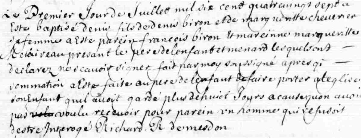 ° 01.07.1687 BIRON Denis « fils de Denis et Marguerite Cheverier, parrain François Biron, marraine Marguerite Metaireau, présent le père de l’enfant et Menard lesquels ont déclaré ne savoir signer, fait par moi soussigné après que sommation a été faite au père de l’enfant de faire porter à l’église son enfant qu’il aurait gardé plus de 8 jours à cause qu’on n’avait pas voulu recevoir pour parrain un homme qui refusait d’être interrogé »