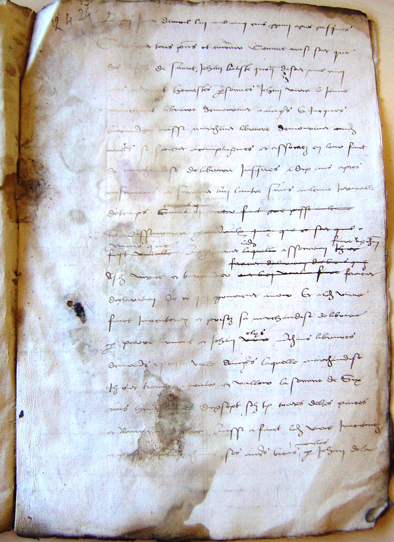 L’acte est en mauvais état et je ne vous livre donc qu’une partie, mais on y lit sur les premières pages que 2 libraires sont associés depuis 2 ans en affaires de marchandise de librairie, sans doute pour leurs approvisionnements, ce que je trouve très moderne pour être déjà il y 5 siècles. Mais ils ont oublié de passer pour cette association chez un notaire pour valider leur contrat, donc l’acte est un entérinement devant notaire de leurs modalités d’association. Il semble que lorsqu’un livre manquait chez l’un l’autre assurait la livraison etc… Mais, ce qui m’a paru le plus surprenant c’est que Varice, l’un des 2 libraires, avait fait faire un inventaire de toute sa librairie par 2 autres libraires, ce qui signifie qu’il y a 5 siècles il y avait au moins 4 libraires à Angers, qui certes vendaient dans tout l’Anjou, mais c’est tout de même remarquable.