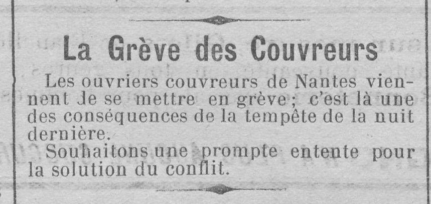 On peut dire, sans crainte d’être taxé d’exagération, qu’il n’y a pas, à Nantes, une seule maison absolument indemne. Toutes ont eu plus ou moins quelques ardoises enlevées, et il faudra les faire visiter par les couvreurs … quand ceux-ci auront repris le travail, car, comme nous le disons par ailleurs, les couvreurs ont déclaré la grève ce matin.