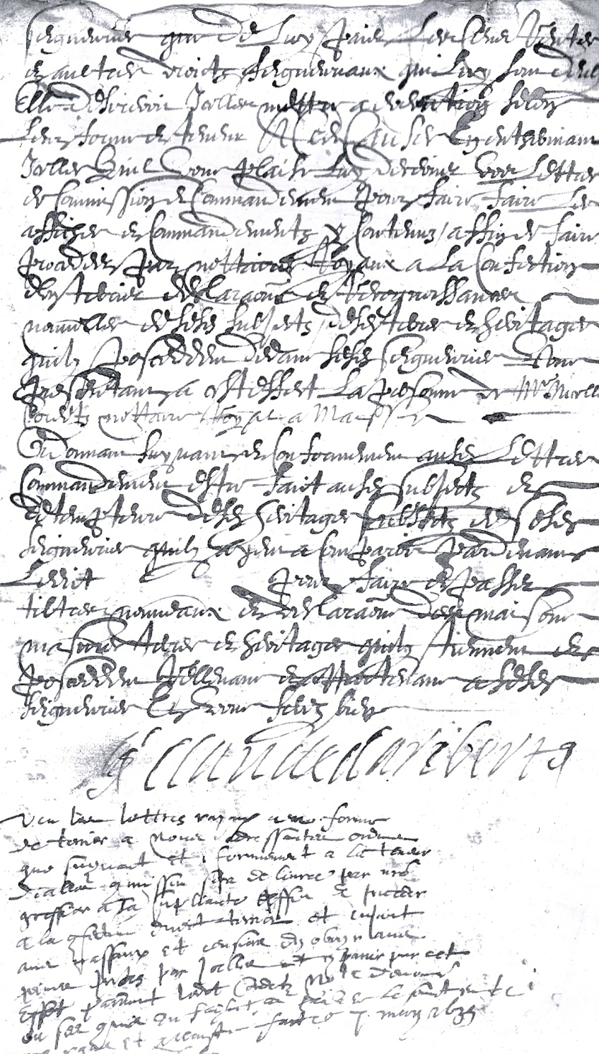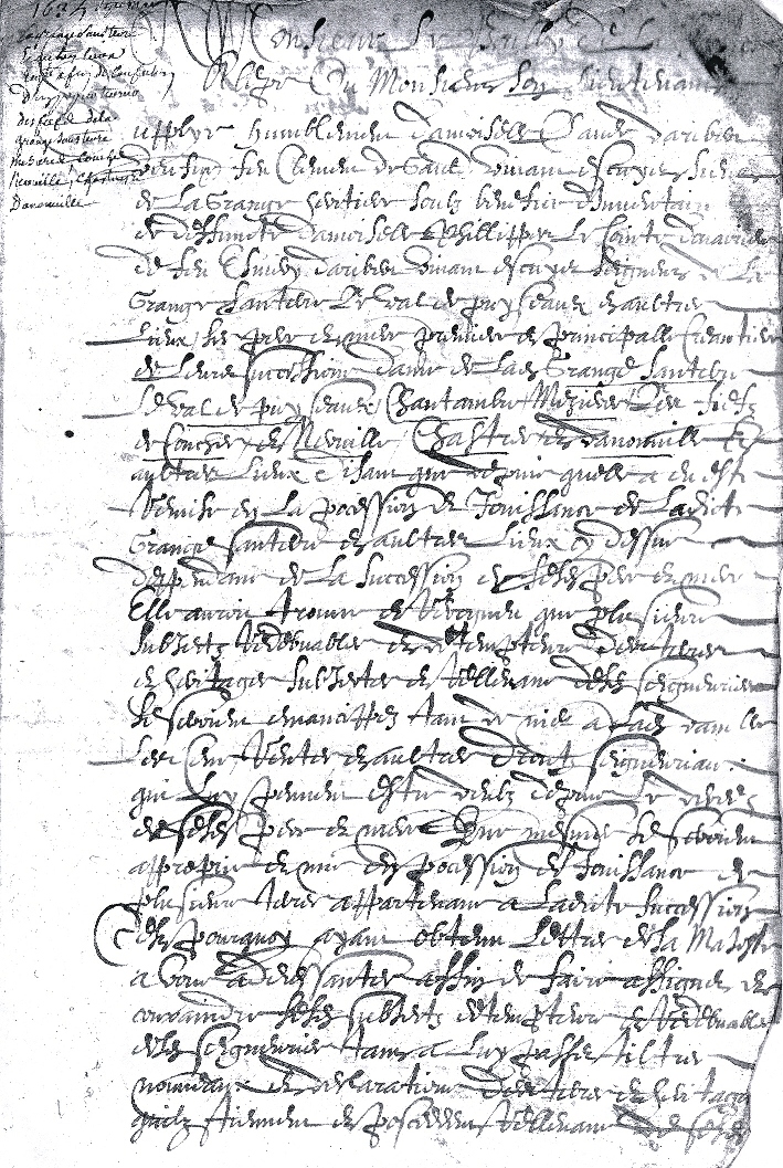 AD91-B1882 « Monsieur le bailly de la … ou monsieur son lieutenant. Supplye humblement damoiselle Claude Daribert veufve feu Clément de Gault vivant escuyer sieur de la Grange, héritière soubz bénéfice d’inventaire de deffuncte damoiselle Phillippes Lecointe douairière de feu Esmery Daribert vivant escuyer seigneur de la Grange Santerre le Val de Puyseaux et aultres lieux ses père et mère, première et principalle créantière de leur succession, dame de ladite Grange Santerre le Val de Puyseaux Chantambre Mesières les fiefs de Conches et Nerville, Chastres et Danonnille et aultres lieux, disant que depuis qu’elle en a esté remise en la possession et jouissance de ladite Grange Santerre et aultres lieux cy dessus despendant de la succession de sesdits père et mère elle auroit trouvé et recognu que plusieurs subjectz redevables et déptempteurs des terres et héritages subjetes et rellevant desdites seigneuries se seroient émancippés tant de nier à ladite damoiselle les cens rentes et aultres droits seigneuriaux qui luy peuvent estre eubz depuis le décès de sesdits père et mère, que mesme se seroient approprié et mis en possession et jouissance de plusieurs terres appartenant à ladite succession, c’est pourquoi ayant obtenu lettres de sa majesté à vous adressantes affin de faire assigner et convaincre lesdits subjects détempteurs et redevables desdites seigneuries tant à luy passer tiltres nouveaux et déclarations des terres et héritages qu’ils tiennent et possèdent rellevant de ses (f°2) seigneuries que de luy paier les cens rentes et aultres droicts seigneurieux qui luy sont deubs elle desireroit icelles mettre à exécution selon leur forme et teneur, à ces causes en enthérinant icelles qu’ils vous plaise luy décerner vos lettres de commission et commandement pour faire faire les affiches et commandements y contenus, affin de faire procéder par nottaires royaux à la confection … déclarations et recognoissances nouvelles de sesdits subjets desdites terres et héritages qu’ils possèdent dedans sesdites seigneuries … présentant à cest effet la personne de Me Nicollas Courts nottaire royal à Maisse, ordonnont suyvant et confirmément auxdites lettres commandement estre fait auxdits subjets et détempteurs desdits héritages subjets desdites seigneuries qu’ils ayent à comparoir par devant ledit (blanc) pour faire et passer tiltres nouveaux et déclarations des maisons masures terres et héritages qu’ils tiennent et possèdent rellevant et appartenant à sesdites seigneuries … » Note de bas de page : obtenu le 7 mai 1635