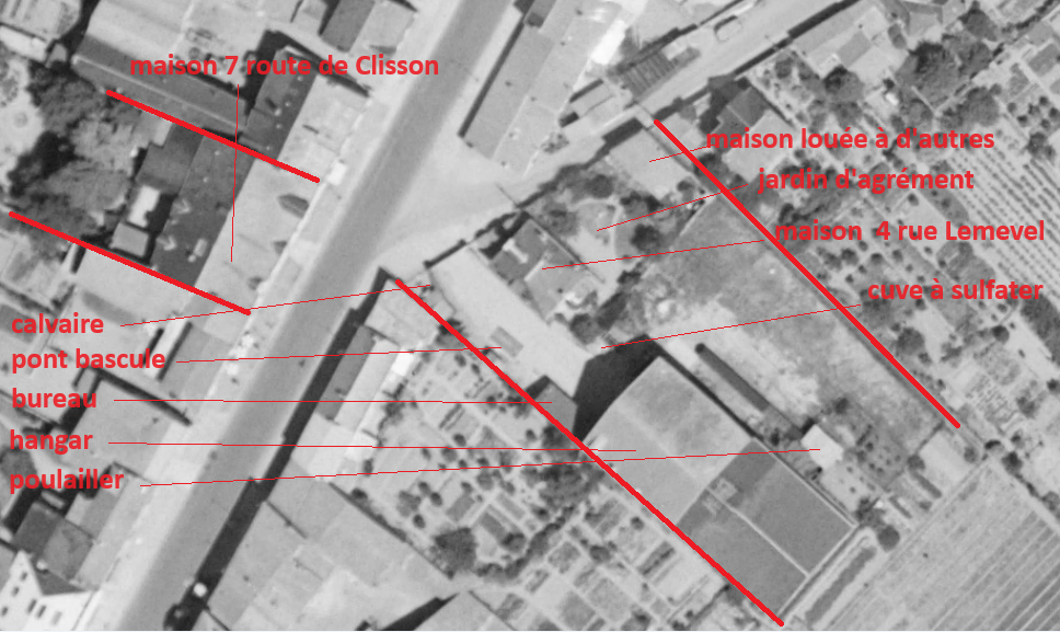 Le hangar de bois était immense (ici à droite en bas, avec 2 couleurs de toiture). Non seulement il était profond, mais il était très haut, avec aussi un étage où il y avait quelques machines pour la fabrication des paillassons, que les maraîchers utilisaient alors bien avant la transformation en serres de toute la ville de Saint Julien de Concelles par les maraîchers.