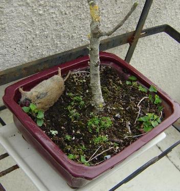 A la mi-journée, lorsqu’Odile a le dos tourné, il remonte déposer subrepticement une proie au soleil mais à l’abri des curieux, et pour cela, il adore choisir les petits pots de fleur d’Odile.