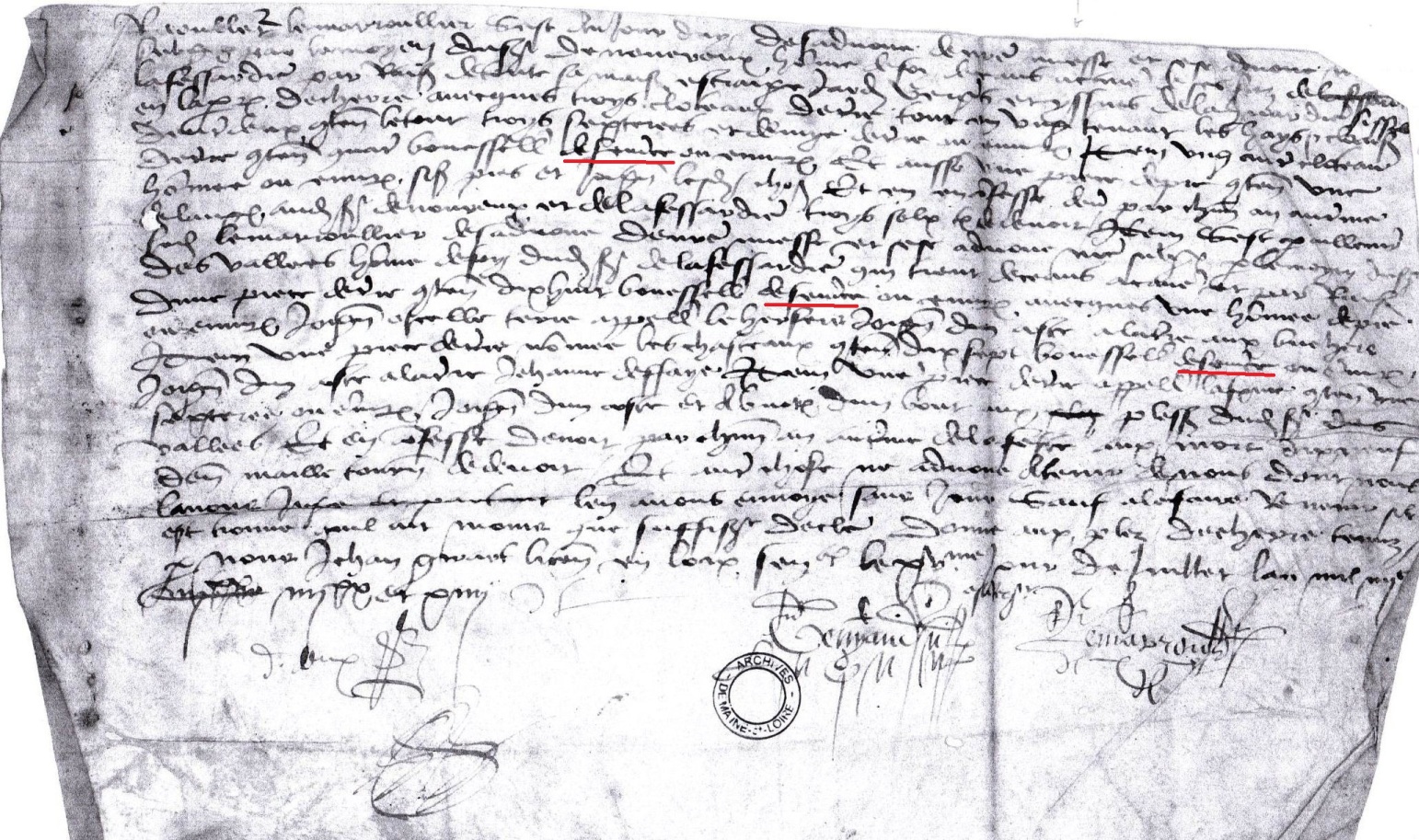 Le 24 avril 1590, à toux ceux qui ces présentes lettres verront François Morin cordeleur juré en ce ressort d’Anjou demeurant en la paroisse de Saint-Denis d’Anjou scavoir faisons que ce jourd’huy 24 avril 1590 à la requeste et prière de honneste homme Jacques Sillet Dauvignon demeurant au lieu de la Triollaye paroisse de Champigné requérant cordelage estre fait de certaines choses héritaux sises au lieu de la Pasturerie paroisse de Cherré desquelles choses les seigneurs et détenteurs doibvent par chacun an de ernte au seigneur de la Verroullière 2 escuz sol et 8 chapons afin du département par entre eulx et pour plus facilement poyer advenir ladite rente chacun au prorata de ce qu’il tient en ladite faresche, ont esté cordellées les choses subjettes à ladite rente, assistaient au présent cordelage chacuns de honnestes personnes missire Jullien Silmon prêtre, Macé Vissault, Jehan Buscher, Nicolas Rahier, Charles Bourdays, la Bellangère, Mathurin Chesneau, Barbe Defaye et le fils de Gervaise Crosnier pour son père fareschaux desdites choses pour lequel cordelage et despartement de ladite somme de 2 escuz y avons vacqué comme s’ensuit,
