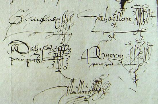 L’acte qui suit est extrait des Archives Départementales du Maine-et-Loire, série 5E2 – Voici la retranscription de l’acte : Le 36 mars 1545 en la court royal d’Angers endroit par davant nous Marc Toublanc notaire d’icelle court personnellement estably Georges Lemotheux paroissien de Marigné au nom et comme soy faisant fort de Jacques Lemaczon paroissien de Cheffes,