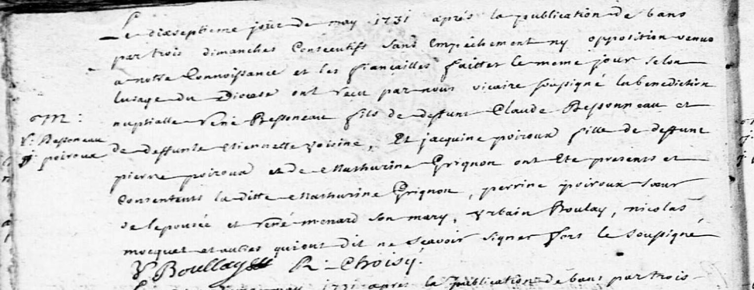 Lorque Pierre BESSONNEAU °Saint-Clément-de-la-Place 1er avril 1736 †StClément 31 juin 1771 Fils de René BESSONNEAU et Jacquine POIROUX épouse à Saint Clément-de-la-Place le 26 juin 1764 Perrine CRUBLEAU, il ne sait pas signer, pas plus que son père, pas plus que son fils ne le saura en épousant à Saint-Clément-de-la-Place le 7 ventôse an II (25 février 1794) Marie CARMET.