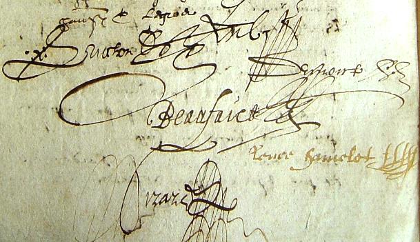 Eh oui, vous avez bien lu ! ce petit papier est collé sur la contrat de mariage de Guilloteau en 1635 à CHâteau-Gontier.