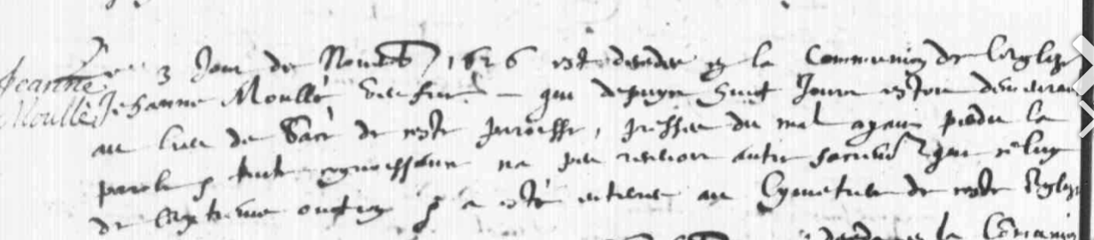 Bonchamp « Le 3 novembre 1626 est décédée en la communion de l’église Jehanne Moullé veufve qui depuys huit jours estoit demeurante au lieu du Sacé de ceste paroisse, pressée du mal ayant perdu la parolle et toute cognaissance n’a pu recevoir autre sacrement que celuy de l’extrême onction et a esté enterrée au cymetière de ceste église »