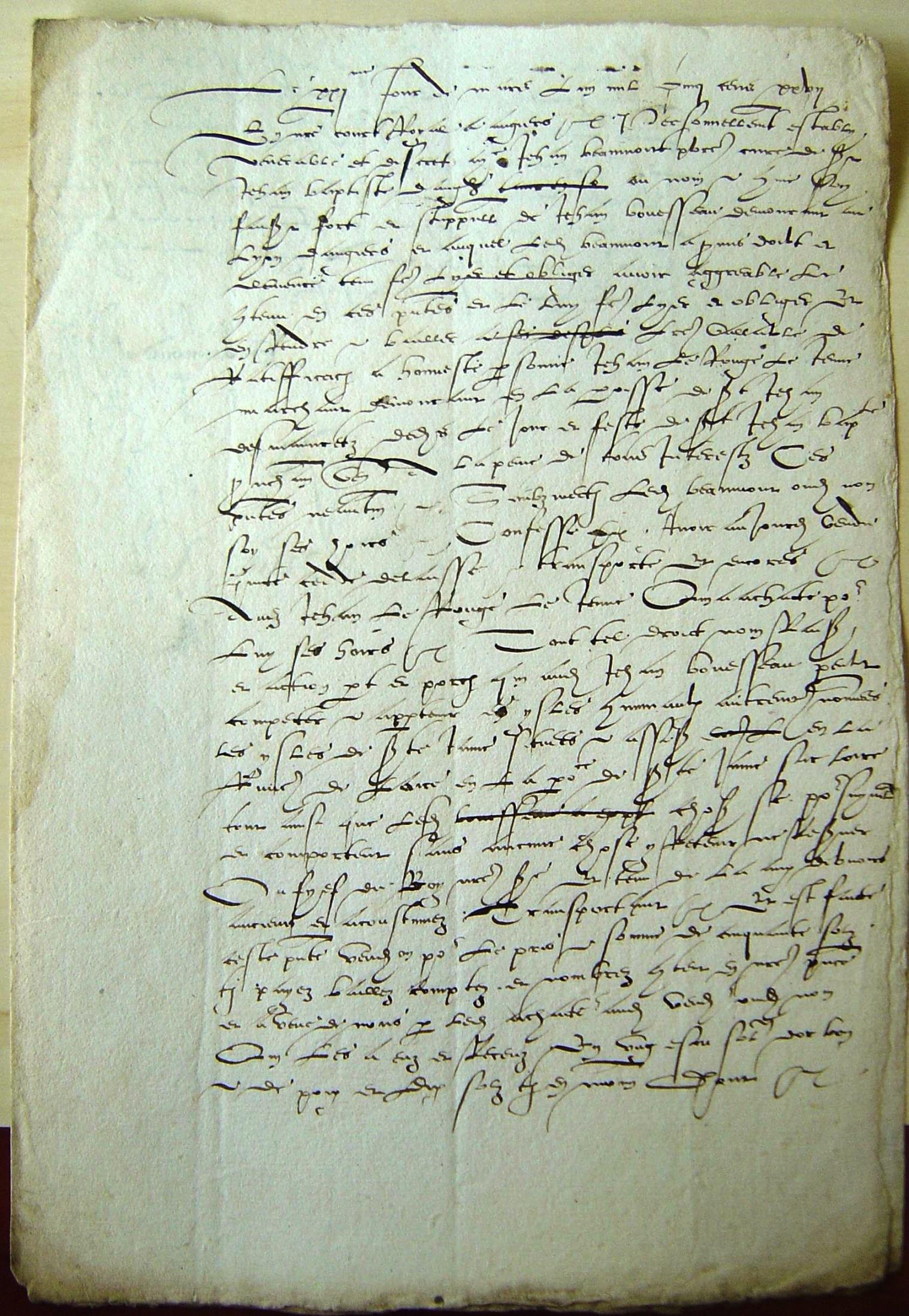 Le 20 janvier 1521 (avant Pâques, donc le 20 janvier 1522 n.s.) en la cour du roy notre sire à Angers (Nicolas Huot notaire Angers) personnellement estably sire Jacques Villiers sieur de Champcharles demourant à Angers d’une part et Estienne Maillart et Bastien Porcher paroissiens de Sainte Jame sur Loire ainsi qu’ils disent d’autre part soubzmetans ledit Villiers soy ses hoirs etc et lesdits Maillart et Porcher eulx et chacun d’eulx seul et pour le tout sans division de parties ne de biens leurs hoirs etc confessent avoir aujourd’huy fait les marchés pactions et conventions tels et en la manière qui s’ensuit c’est à savoir que ledit sieur Jacques Villiers a baillé et baille auxdits Maillart et Porcher qui ont prins et accepté de luy une petite place de perrière estant en les vignes dudit Villiers à son lieu de Champcharles laquelle est clouse à murailles et tout ce qui luy en appartient d’icelle pièce seulement pour tirer de la pierre d’icelle perrière tout ce qu’il en pourroit tirer jusques à la fin du mois de mars prochainement venant, sans faire aulcun dommages en icelle vigne et aussi seront tenus lesdits preneurs refaire la muraille qu’ils abbatront bien et duement à leurs cousts et mises et s’ils en abbatent deux toises feront incontinent refaire, et remplaceront le foussé qu’ils feront, et icelle rendre preste à planter de la vigne, et oultre seont tenuz lesdits preneurs bailler pour forestage audit Villier le nombre de 10 charestes de pierre bonne et marchande et rendront toute icelle muraille relevée et formée dedans ladite fin dudit mois de mars et celle qui estait abbatue de paravant sans interests, auxquelles choses dessus dites tenir et accomplir etc et aux dommages etc obligent lesdites parties l’une vers l’autre etc mesmes lesdits preneurs eulx et chacun d’eux seul et pour le tout sans division de personne de biens leurs boirs etc renonçant par davant nous au bénéfice de division etc foy jugement et condemnation etc présents ad ce Gervaise Lelasseurs et Charles Furet clercs demeurant à Angers tesmoings, donné à Angers le jour et an susdit
